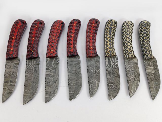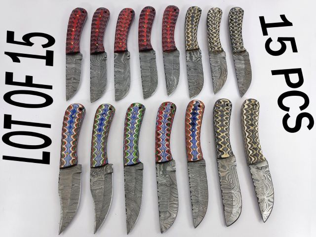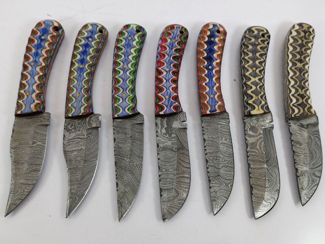 15 pieces Damascus steel Multi color jigged scale skinning knives set with Leather sheath. Over 110 inches long Damascus steel blade knives