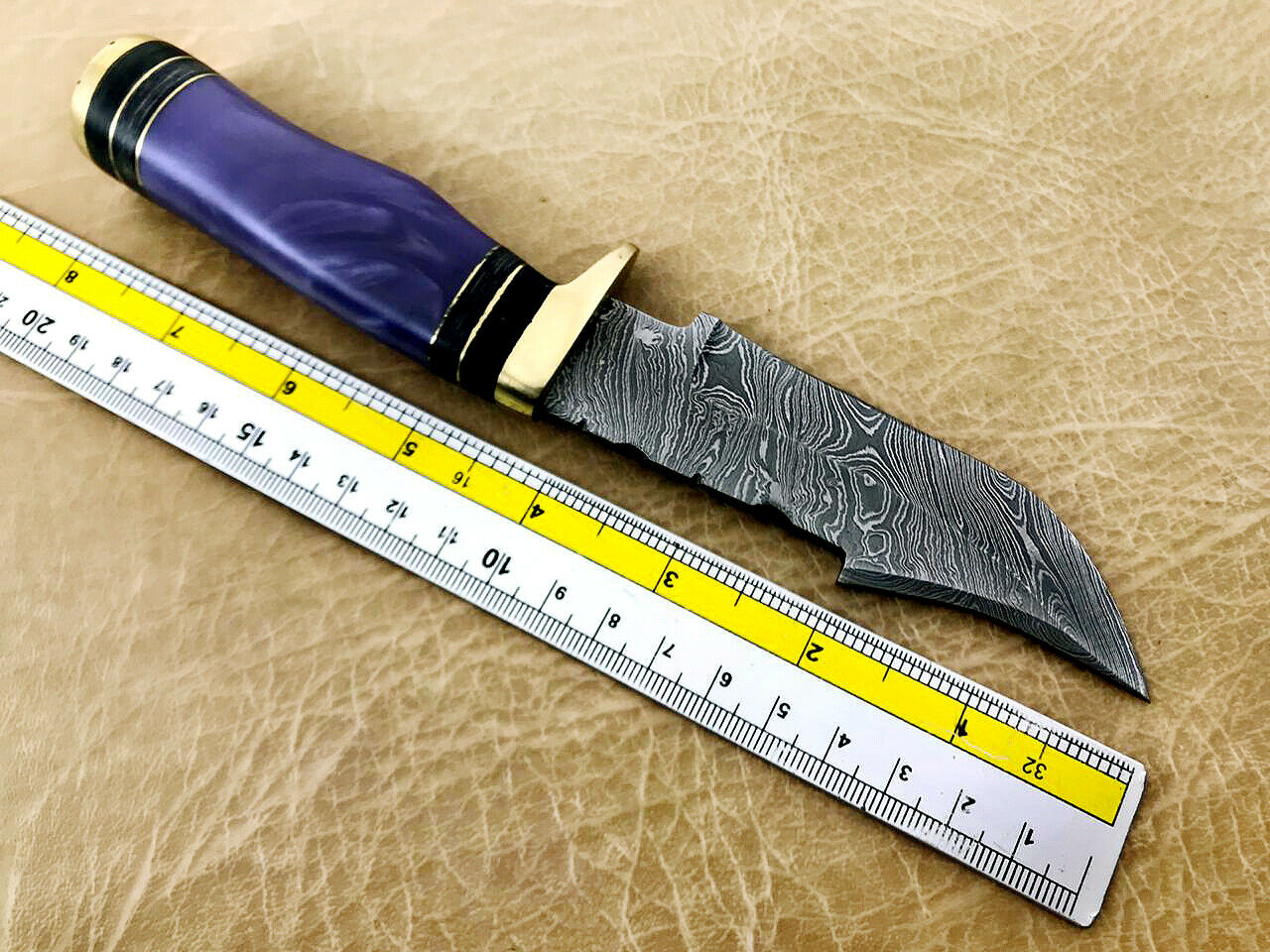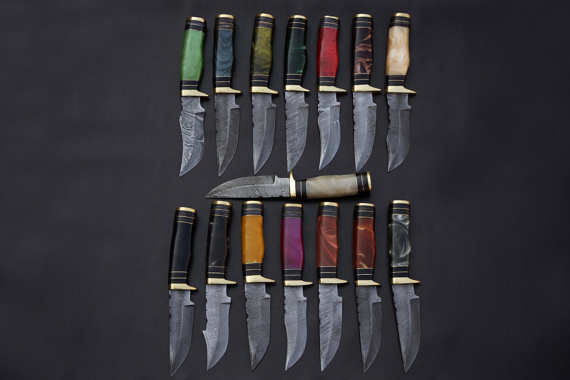 15 pieces Damascus steel Assorted colors Raisen scale skinning knives set. Overall 125 inches long Damascus steel blade knives, Cow hide leather sheath