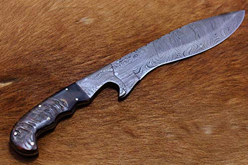 Features: 6" long Camel bone scale with steel bolster, Pommel. Overall 16" Long Bowie knife. 9.5" long hand forged Damascus steel blade with 9 Inches cutting edge Approximately 5 mm Thick rain drop pattern Damascus steel Up to standard hunting Bowie Knife Comes with a fine quality extra thick and robust leather sheath. The sheath has belt inserting loop and can be worn on belt. Blade is made of Damascus steel by forging the 1095 and 15N20 high and low carbon steel Our Damascus steel is prepared by forging over 465 layer of high carbon and low carbon steel. Blade has been given an excellent heat treatment to get it well hardened Hardness 56 to 58 HRC. Tips to Care Damascus knife: Damascus steel as well as 1095 high carbon steel knives are different than some other common steel knives,because of its high carbon content they can be rusted if not care properly. If you have seen rust accidentally then use WD40 to remove it Never store your knife for long time in leather sheath. Leather can absorb water which will rust the knife. Always clean the blade after using and apply oil or wax (please use cooking oil on Chef Knife) before you store it, for its longer life and durability. DISCLAIMER: Our knives are very sharp so open and use them very carefully. We are not responsible for any injuries associated with the use of our knives. Our products are intended for legal use only by responsible buyers. We will not sell our products to anyone under the age of 18.