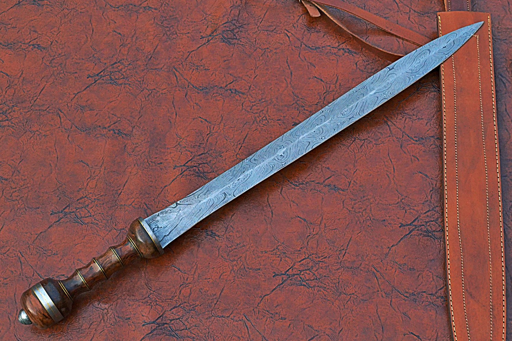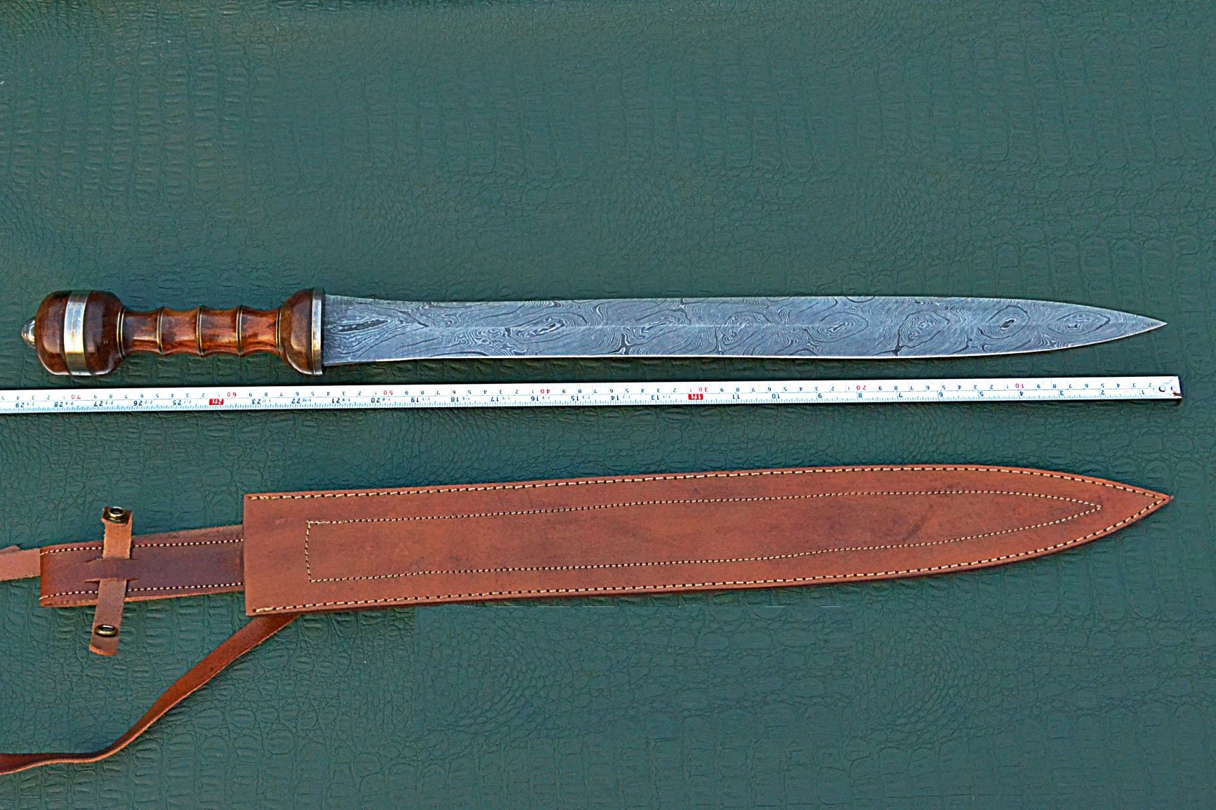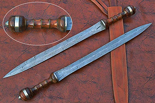 29 inches Long Maximus Gladuis Sword, 21" Long Hand Forged Damascus Steel Double Edge Blade, Hand Crafted Walnut Wood Grip with Brass Spacer, Leather Scabbard with Shoulder Stripe