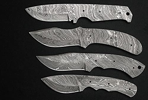 Features: 4 pieces Damascus steel full tang blade skinning knives set Overall 30 inches Damascus steel blade. Hand forged twist pattern Damascus steel blank blades. Contains: a) 8.5" long knife with 4.5" cutting edge. clip point blade with 3 pins and a Mossaic hole. b) 8.5" long skinning knife with 4" cutting edge. 6 pin holes and a Mossaic pin space. c) 7.5" long skinning knife with 3.5" cutting edge. Holes for 3 pins and a mosaic. d) 9.5" long skinning knife with 5" cutting edge. Holes for 2 pins. Full tang blades are considered stronger and durable then non full tang Approximately 3 mm Thick Twist pattern Damascus steel clip point blade. Up to standard skinning and Pocket Knives. Blade is made of Damascus steel by forging the 1095 and 15N20 high and low carbon steel Our Damascus steel is prepared by forging over 465 layer of high carbon and low carbon steel. Blade has been given an excellent heat treatment to get it well hardened. Hardness 56 to 58 HRC. Tips to Care Damascus knife: Damascus steel as well as 1095 high carbon steel knives are different than some other common steel knives because of its high carbon content they can be rusted if not care properly. If you have seen rust accidentally then use WD40 to remove it. Never store your knife for long time in leather sheath. Leather can absorb water which will rust the knife. Always clean the blade after using and apply oil or wax (please use cooking oil on Chef Knife) before you store it, for its longer life and durability.