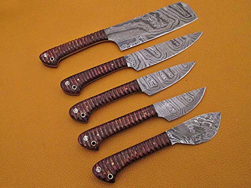 5 pieces Custom made hand forged Damascus steel blade kitchen knife set, Brown jigged scale, Overall 45 inches Length of Damascus sharp knives (10.6+9.6+9.0+8.0+7.6) Inches, Leather suede sheath