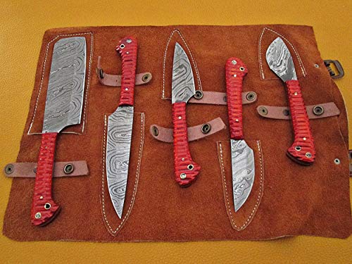 5 pieces Custom made hand forged Damascus steel blade kitchen knife set, Red jigged scale, Overall 45 inches Length of Damascus sharp knives (10.6+9.6+9.0+8.0+7.6) Inches, Leather suede sheath
