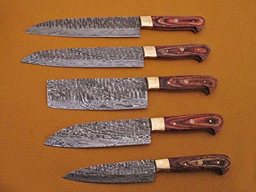 FEATURES: 5 Pieces hand forged hammered Damascus steel kitchen knife set. Red 2 tone Dollar Wood scale with brass bolster. Includes steak knife, Cleaver, Bread knife, Slicer knife. Full tang blade goes through all the handle as well in a single piece so full tang blades are durable and stronger than non full tang blades Overall 40 Inches Long chef Knife set Twist pattern hand forged Damascus steel up to the standard of Kitchen knife, chef knife, cleaver, slicer Blade is made of Damascus steel by forging the 1095 and 15N20 high and low carbon steel with hundreds of layers folded Blade has been given an excellent heat treatment to get it well hardened Hardness 56 to 58 HRC. Tips to Care Damascus knife: Damascus steel as well as 1095 high carbon steel knives are different than some other common steel knives,because of its high carbon content they can be rusted if not care properly. If you have seen rust accidently then use WD40 to remove it Never store your knife for long time in leather sheath. Leather can absorb water which will rust the knife. Always clean the blade after using and apply oil or wax (please use cooking oil on Chef Knife) before you store it, for its longer life and durability.