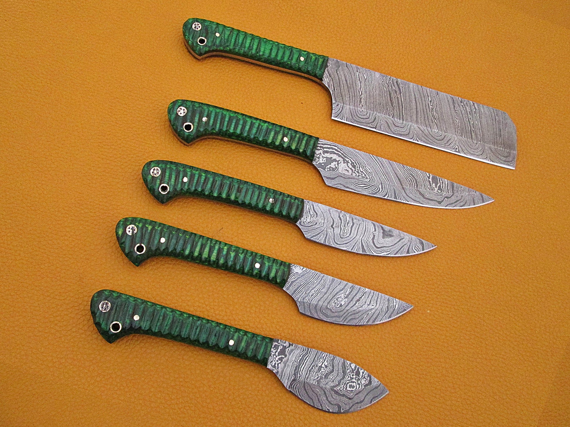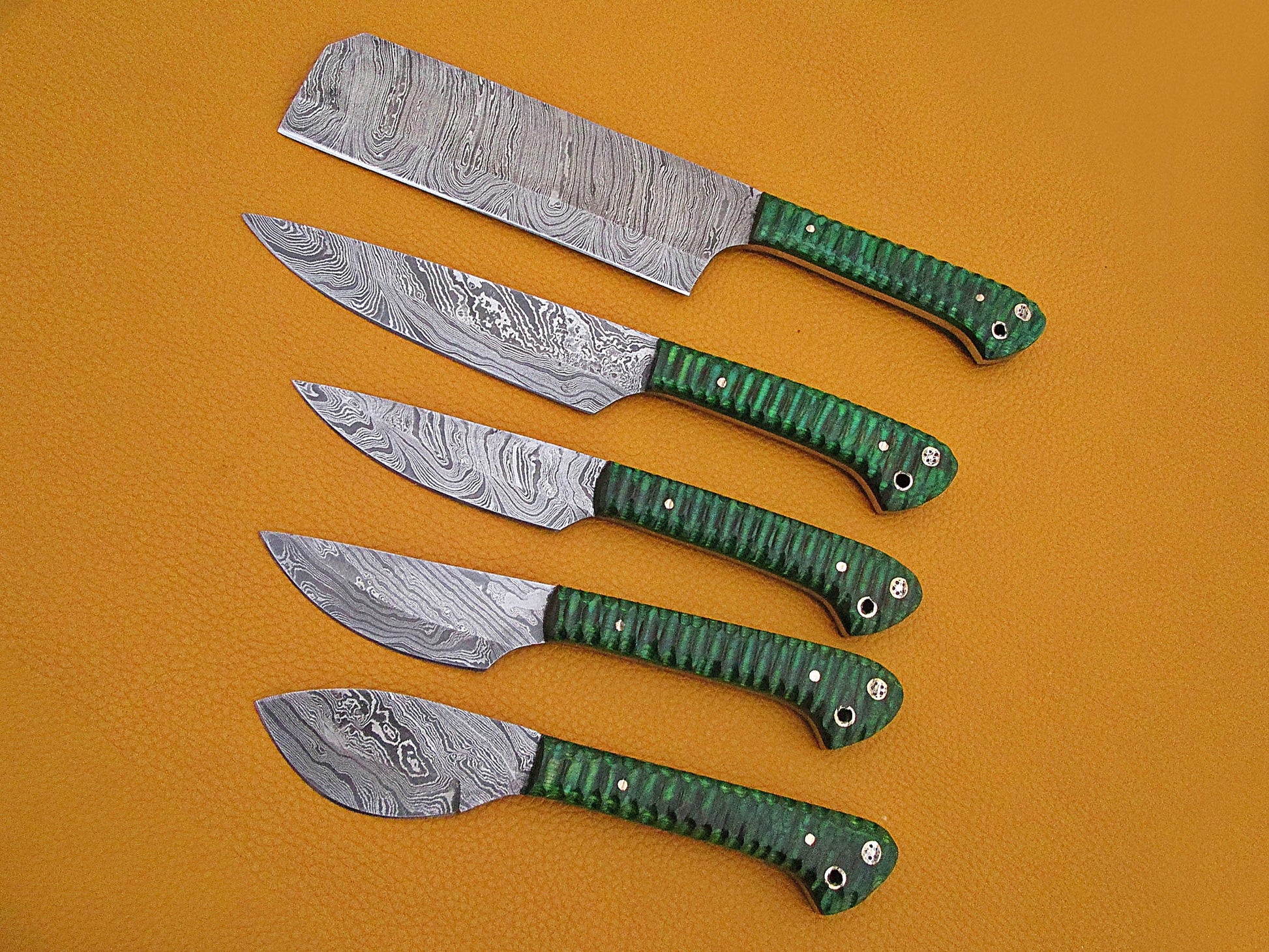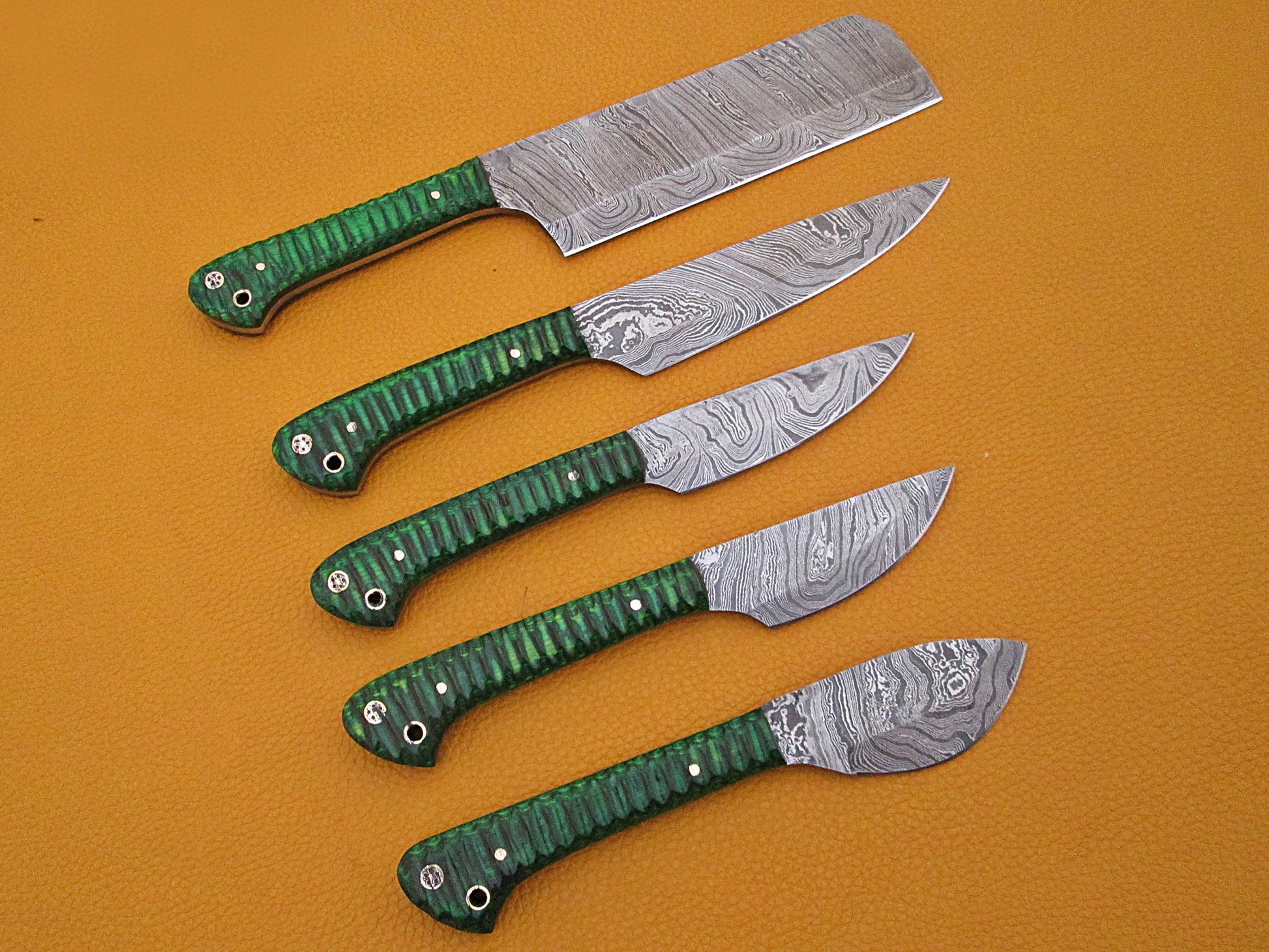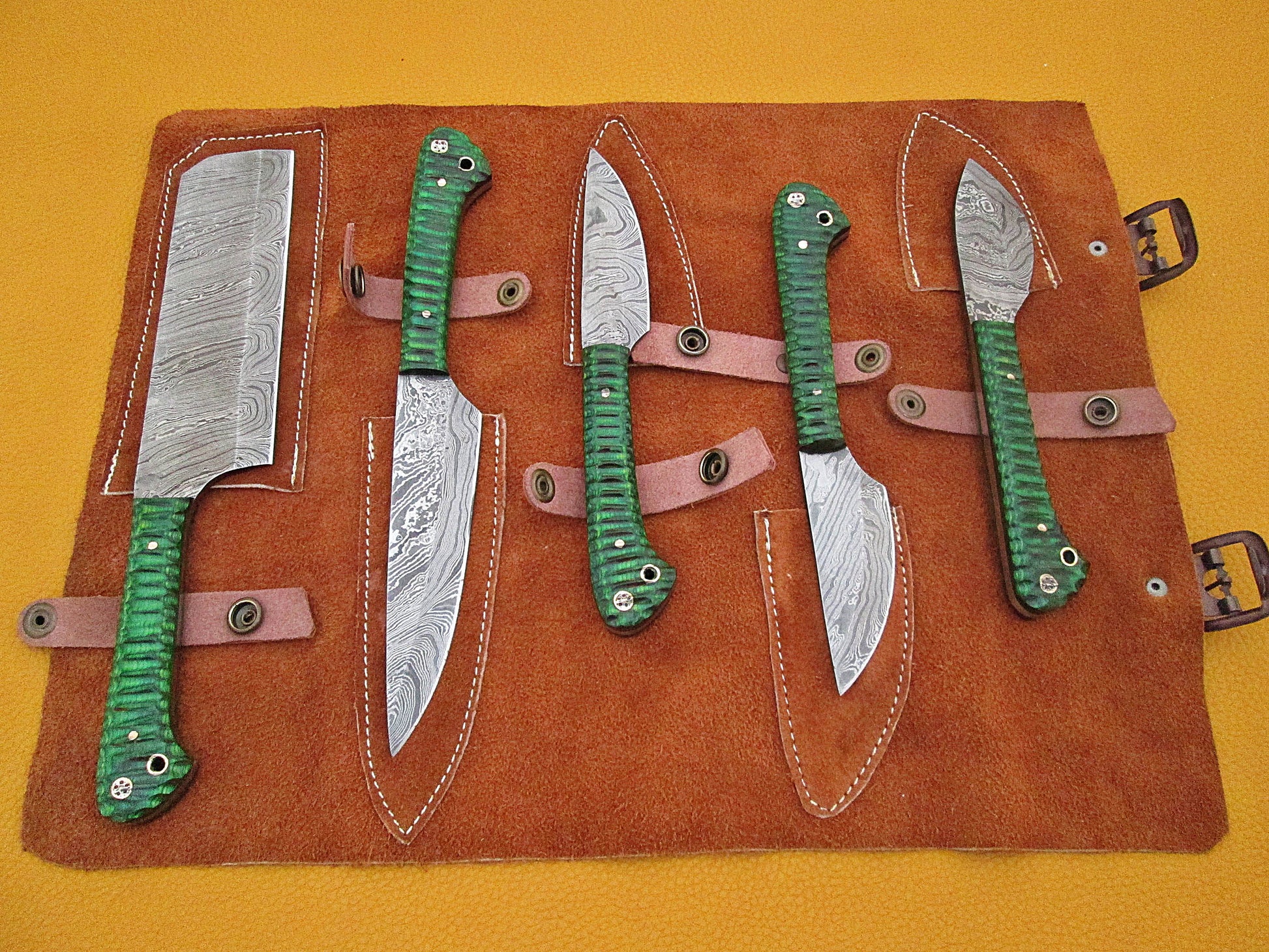 5 Pieces Damascus steel kitchen knife set includes (10.6+9.6+9.0+8.0+7.6)" knives in Green Jigged wood scale, includes Roll able Leather suede sheath