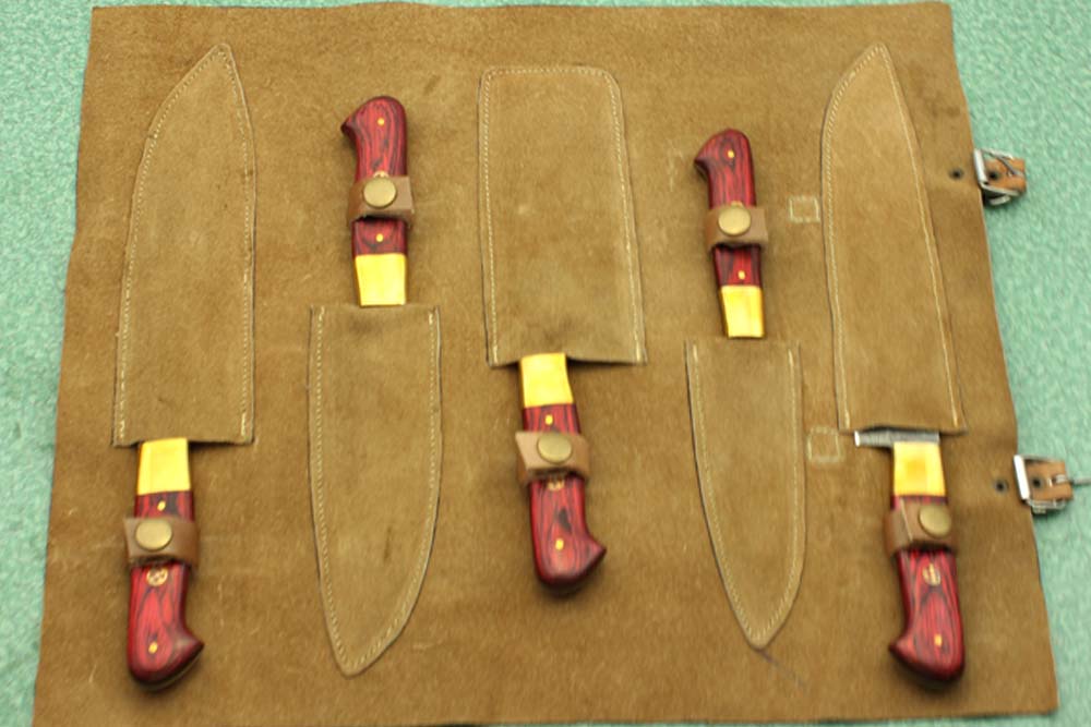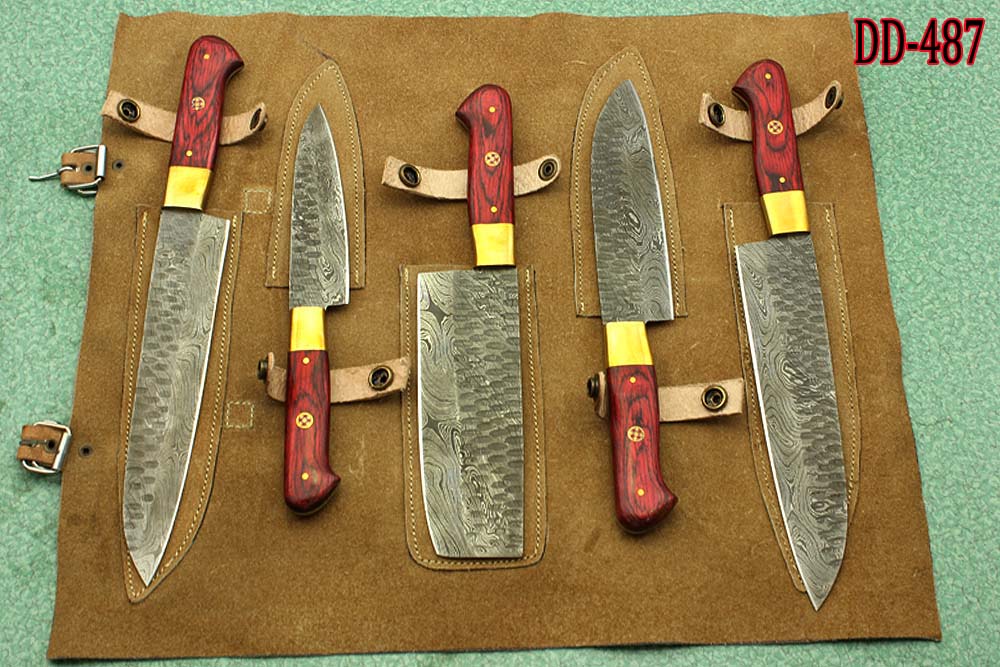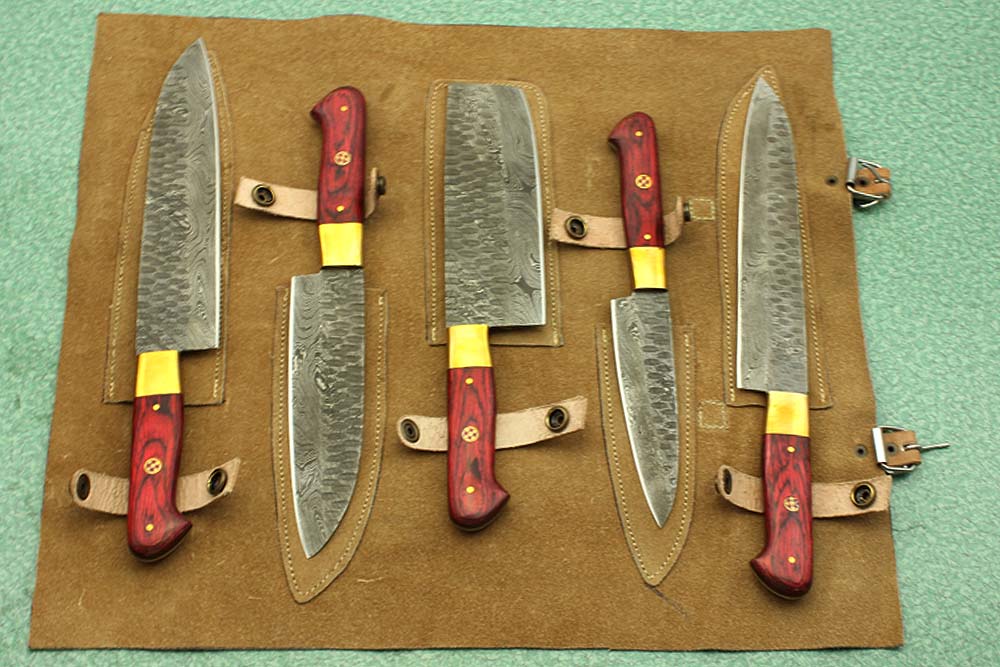 5 Pieces Hammered Damascus steel kitchen knife set, Over 50" long Damascus steel knives in 2 tone Red wood scale, includes Roll able Leather suede sheath