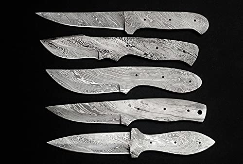 Features: 4 pieces Damascus steel full tang blade skinning knives set Overall 44 inches Damascus steel blade. Hand forged twist pattern Damascus steel blank blades. Contains: a) 8.5" long knife with 4.5" cutting edge. clip point blade with 3 pins and a Mossaic hole. b) 8.5" long skinning knife with 4" cutting edge. 6 pin holes and a Mossaic pin space. c) 7.5" long skinning knife with 3.5" cutting edge. Holes for 3 pins and a mosaic. d) 9.5" long skinning knife with 5" cutting edge. Holes for 2 pins. Full tang blades are considered stronger and durable then non full tang Approximately 3 mm Thick Twist pattern Damascus steel clip point blade. Up to standard skinning and Pocket Knives. Blade is made of Damascus steel by forging the 1095 and 15N20 high and low carbon steel Our Damascus steel is prepared by forging over 465 layer of high carbon and low carbon steel. Blade has been given an excellent heat treatment to get it well hardened. Hardness 56 to 58 HRC. Tips to Care Damascus knife: Damascus steel as well as 1095 high carbon steel knives are different than some other common steel knives because of its high carbon content they can be rusted if not care properly. If you have seen rust accidentally then use WD40 to remove it. Never store your knife for long time in leather sheath. Leather can absorb water which will rust the knife. Always clean the blade after using and apply oil or wax (please use cooking oil on Chef Knife) before you store it, for its longer life and durability.