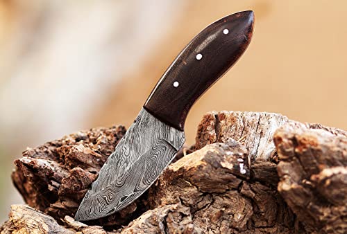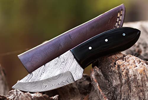 6.5" Long hand forged Damascus steel compact skinning Knife, 3" drop point full tang blade, Natural Camel Bone scale, Cow hide Leather sheath with belt loop (White)
