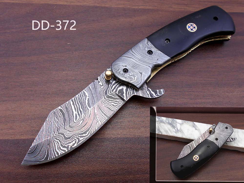 Damascus steel 7.5" folding knife, liner lock, thumb knob, Cow sheath Available in Natural wood, Bull horn & Camel bone scale available Features: Available in Bull Horn, White Camel bone & Natural Rose wood scales with Damascus bolster Scale is blind with 4 screws and a Mosaic pins for extra strength. Overall 7.5" Long Folding knife with 4" folded length 3.5" long Damascus steel Blade with 3" of cutting edge Equipped with strong brass liner lock and thumb pin Custom made Twist pattern Damascus steel Up to the standards of Pocket Knife, Camping Knives, Personalized Knife. Comes with a fine quality extra thick cow hide leather sheath with belt inserting stripe Blade is made of Damascus steel by forging the 1095 and 15N20 high and low carbon steel Blade has been given an excellent heat treatment to get it well hardened Hardness 56 to 58 HRC. Tips to Care Damascus knife: Damascus steel as well as 1095 high carbon steel knives are different than some other common steel knives,because of its high carbon content they can be rusted if not care properly. If you have seen rust accidently then use WD40 to remove it. Never store your knife for long time in leather sheath. Leather can absorb water which will rust the knife. Always clean the blade after using and apply oil or wax (please use cooking oil on Chef Knife) before you store it, for its longer life and durability. DISCLAIMER: Our knives are very sharp so open and use them very carefully. We are not responsible for any injuries associated with the use of our knives. Our products are intended for legal use only by responsible buyers. We will not sell our products to anyone under the age of 18. We will not be responsible for mail lost due to wrong address provided. We will not be responsible for custom held items in your country (For international buyers only). Please check with local custom laws before ordering.