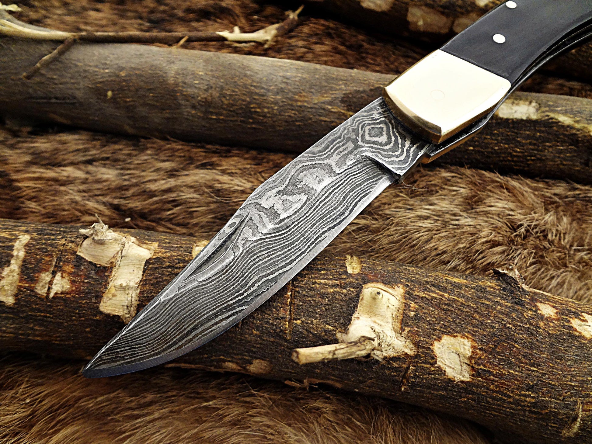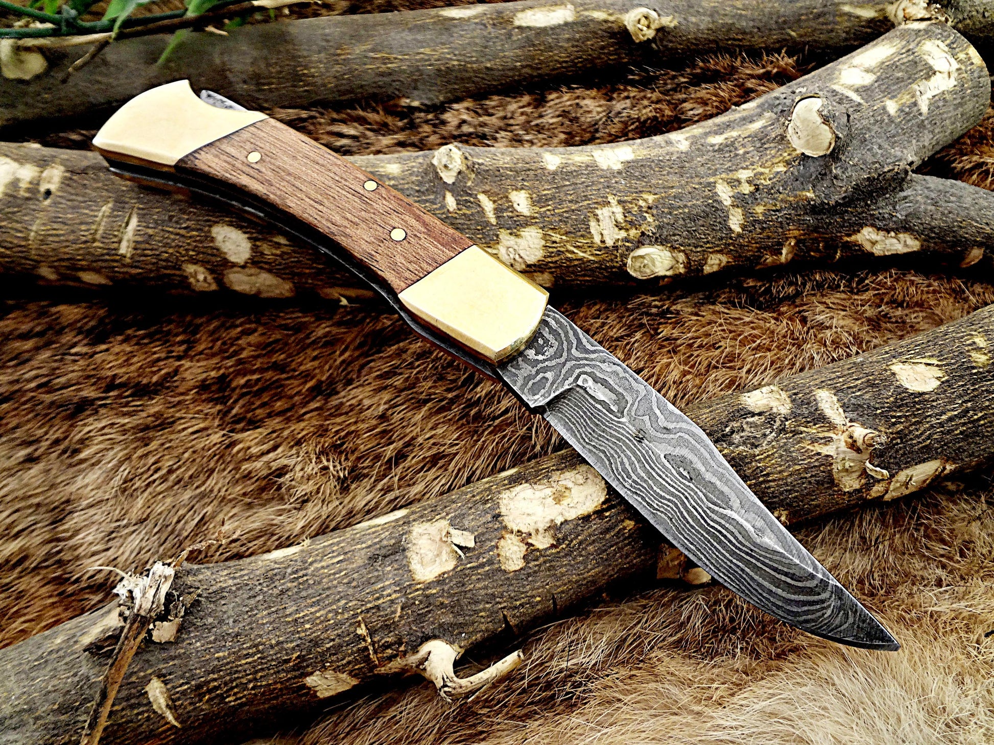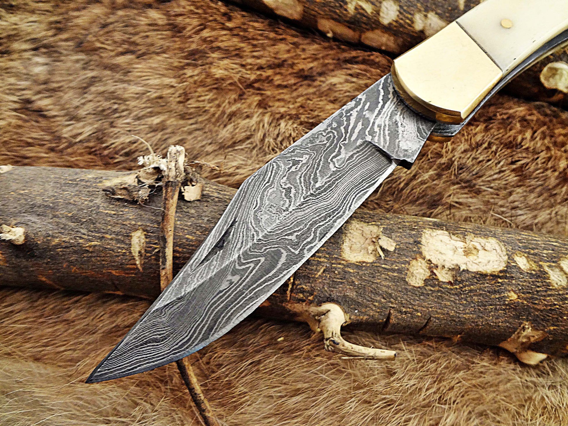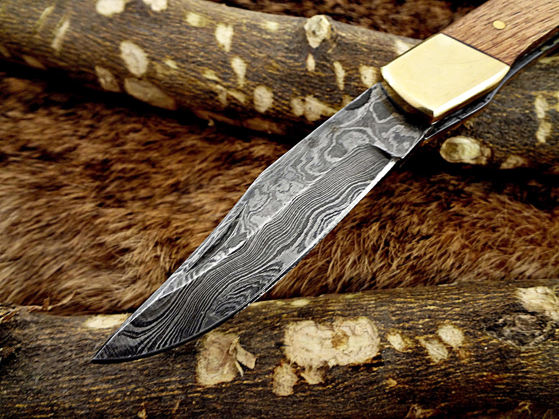 7.5" back liver lock Folding Knife, Hand forged Damascus steel blade, Available in wood, Bone and Horn scales bolster, Comes with cow hide leather sheath