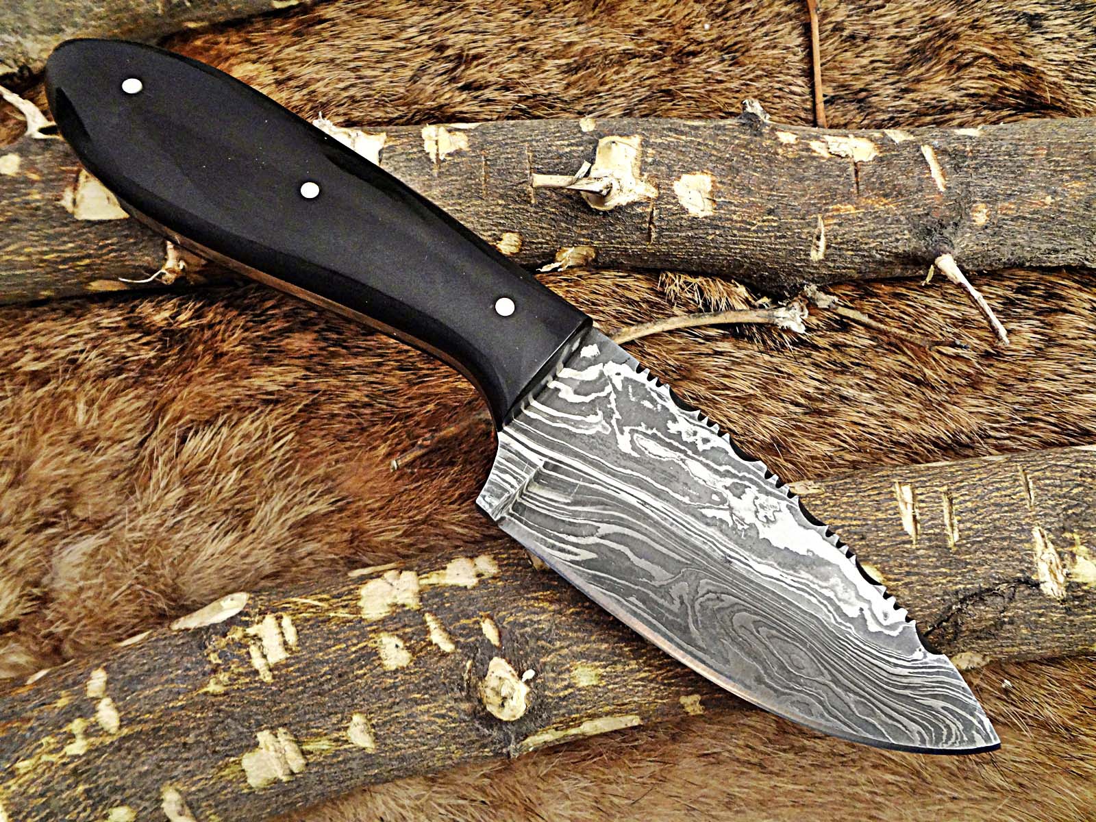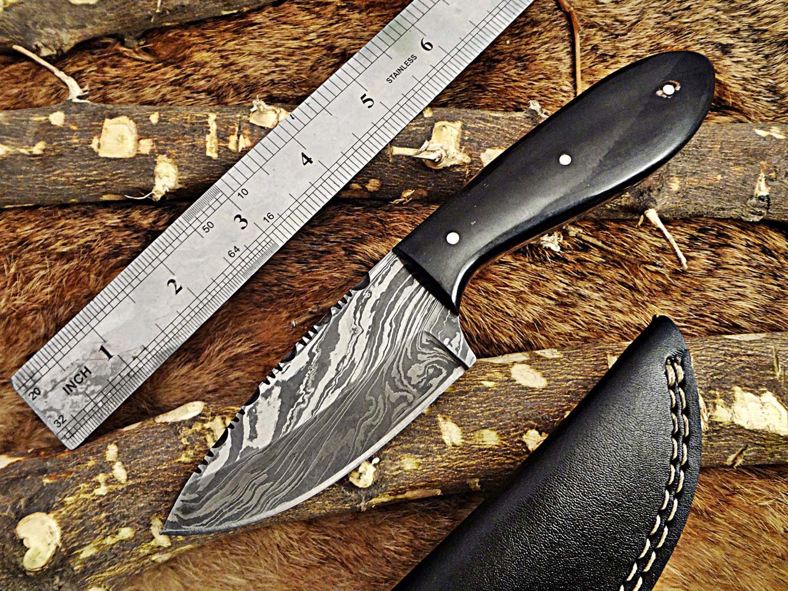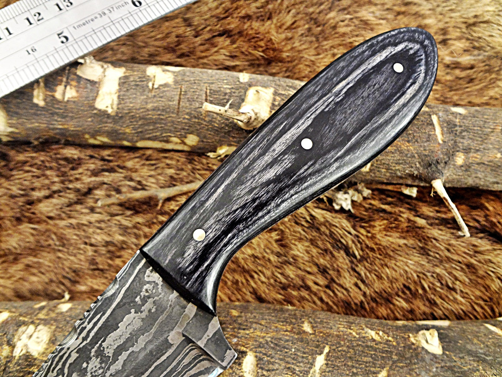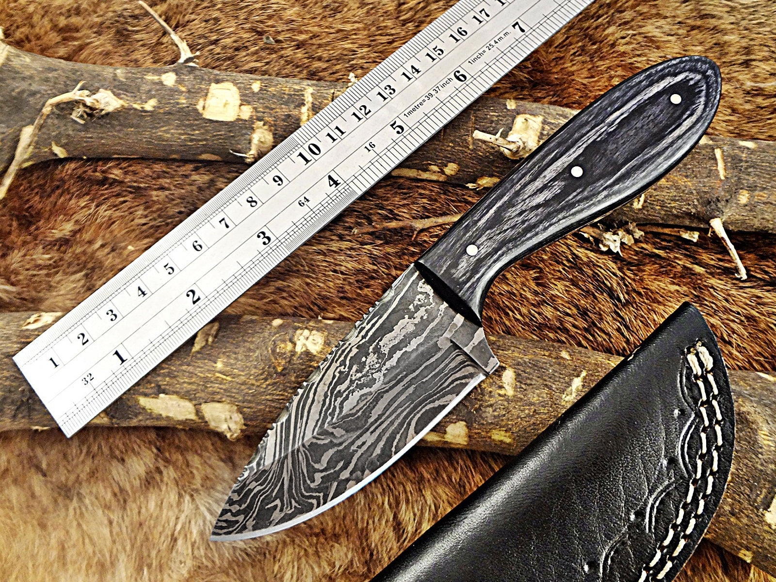 7.5" compact skinning Knife with 4" full tang Damascus steel blade, Available in 2 colors scale, includes Cow hide Leather sheath