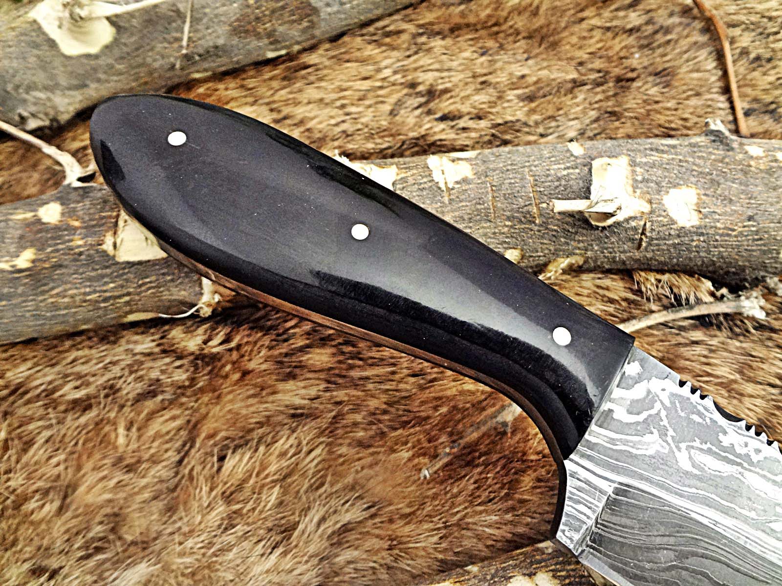 - 7.5″ Long Damascus steel hand forged compact skinning Knife with 4″ drop point full tang blade