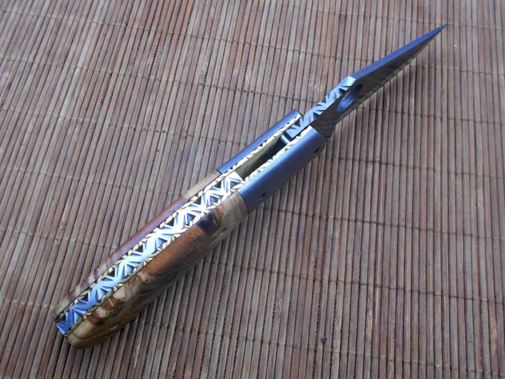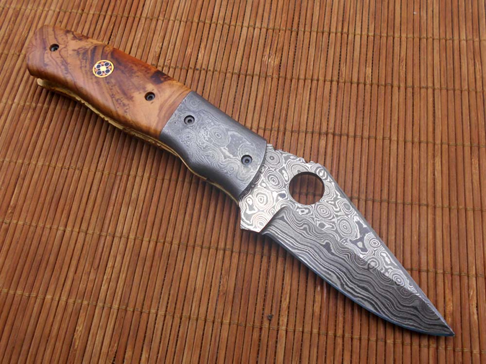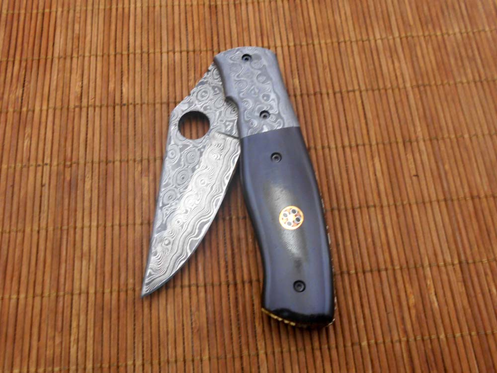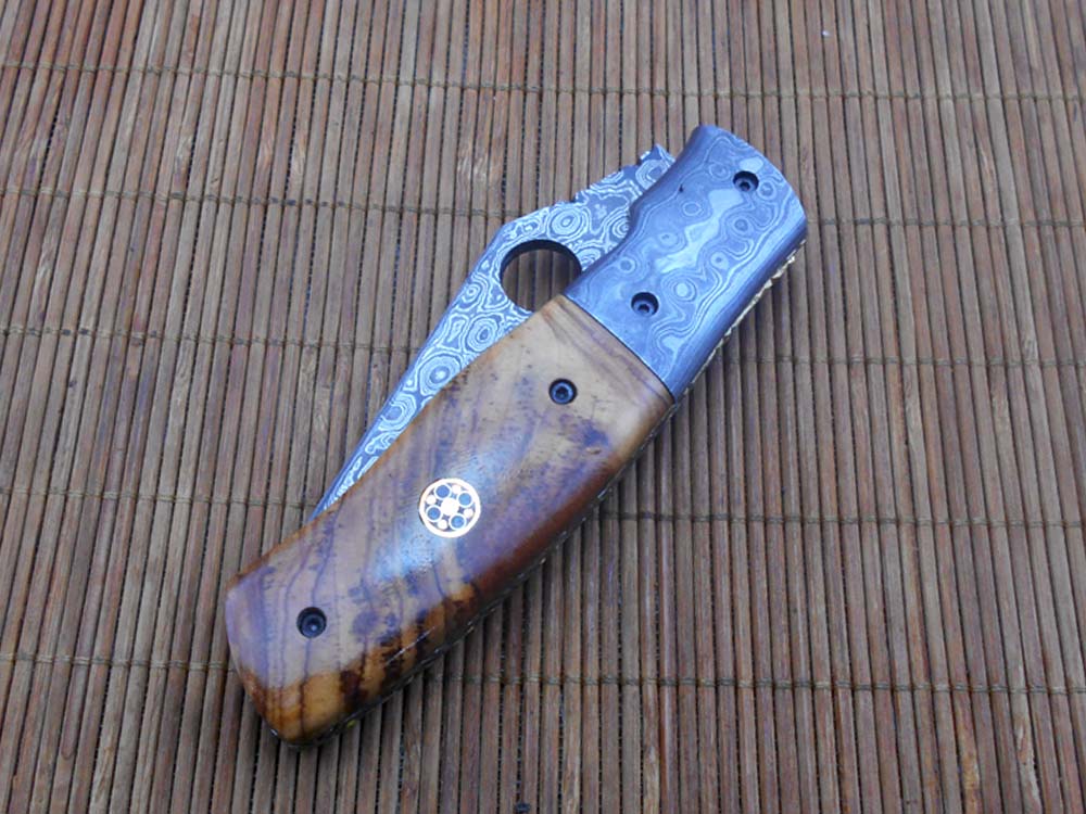 7.5" flat scale folding knife, Damascus steel blade with finger hole, Equipped with liner lock, Available in Wood & Horn scales, Leather sheath included