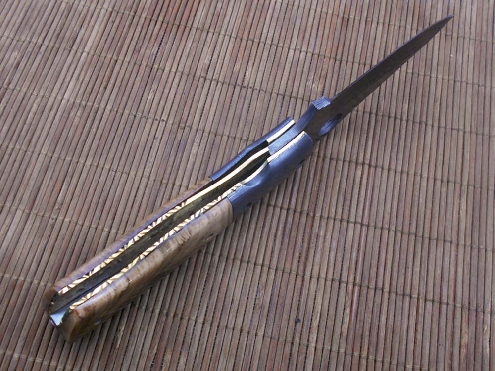 Available in Bull horn and Natural Rose wood scales with Damascus Bolster