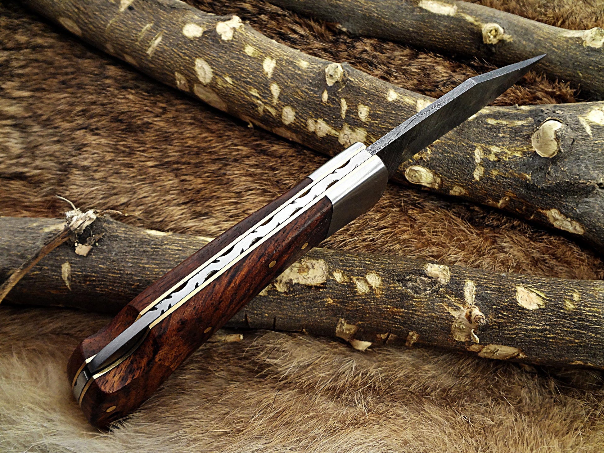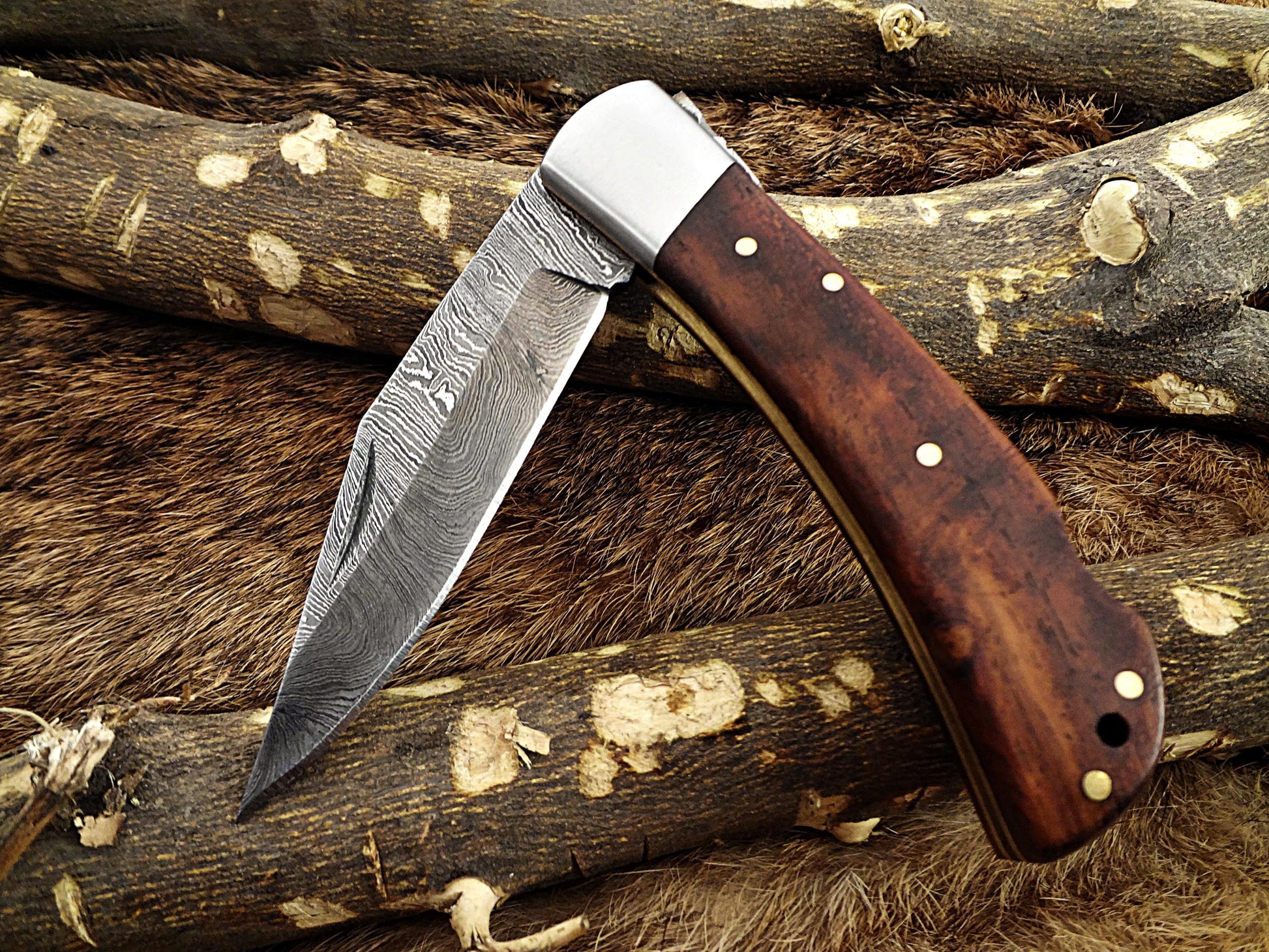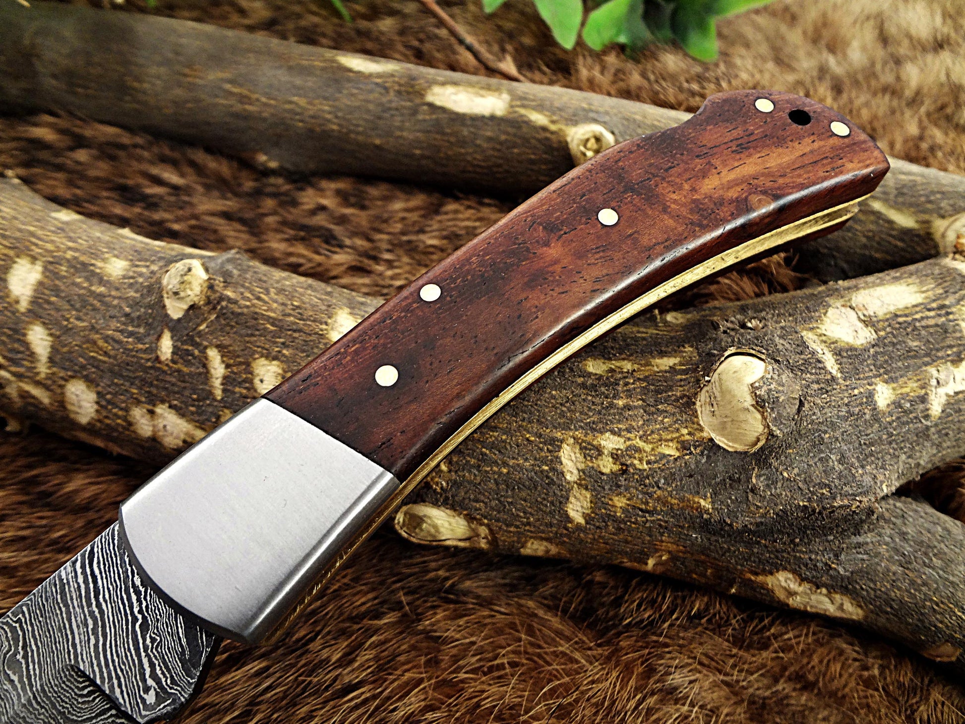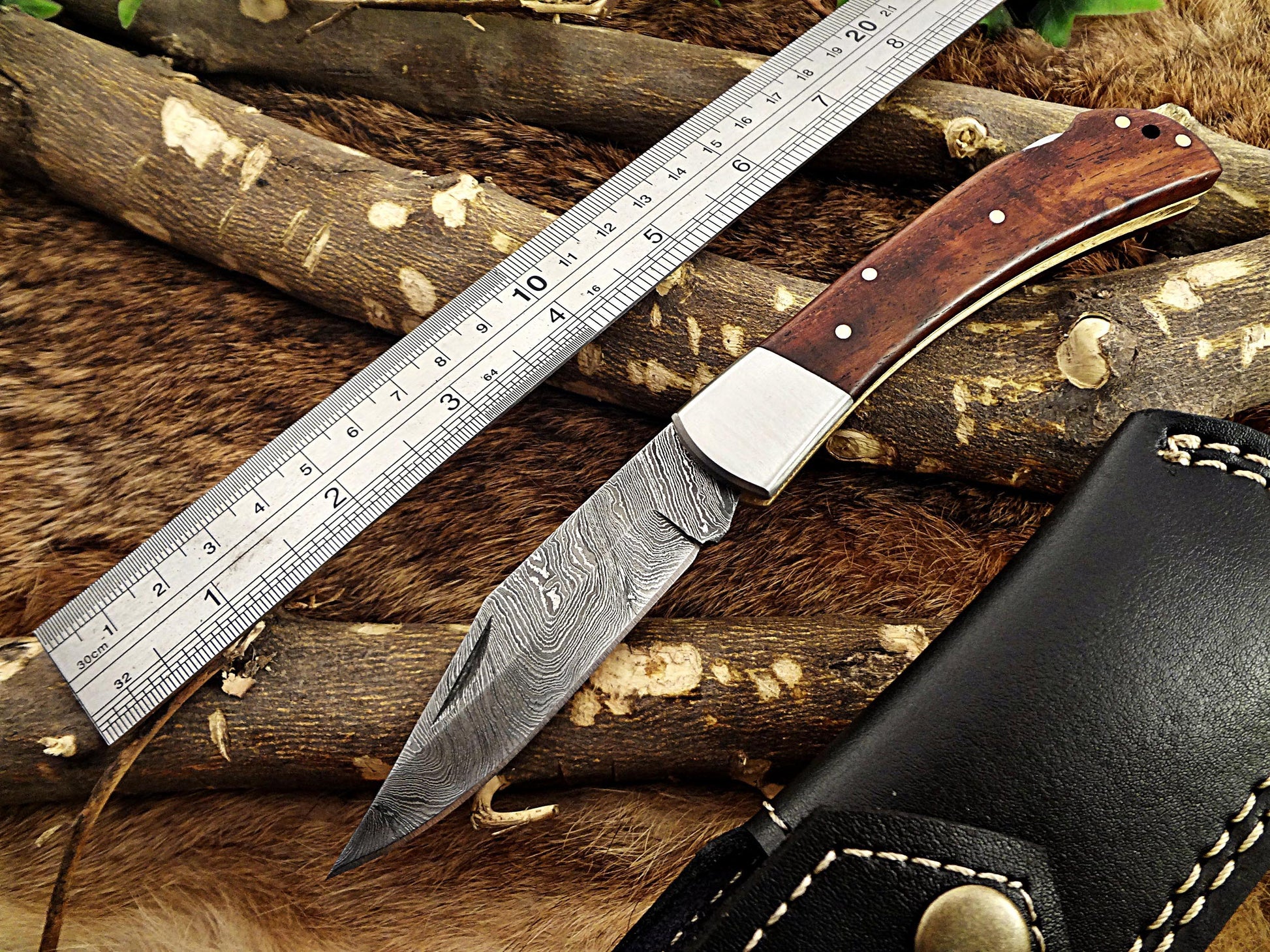 7.5" Folding Knife Damascus steel long, Kao wood with Steel bolster scale, custom made 3.5" Hand Forged blade cow hide leather sheath