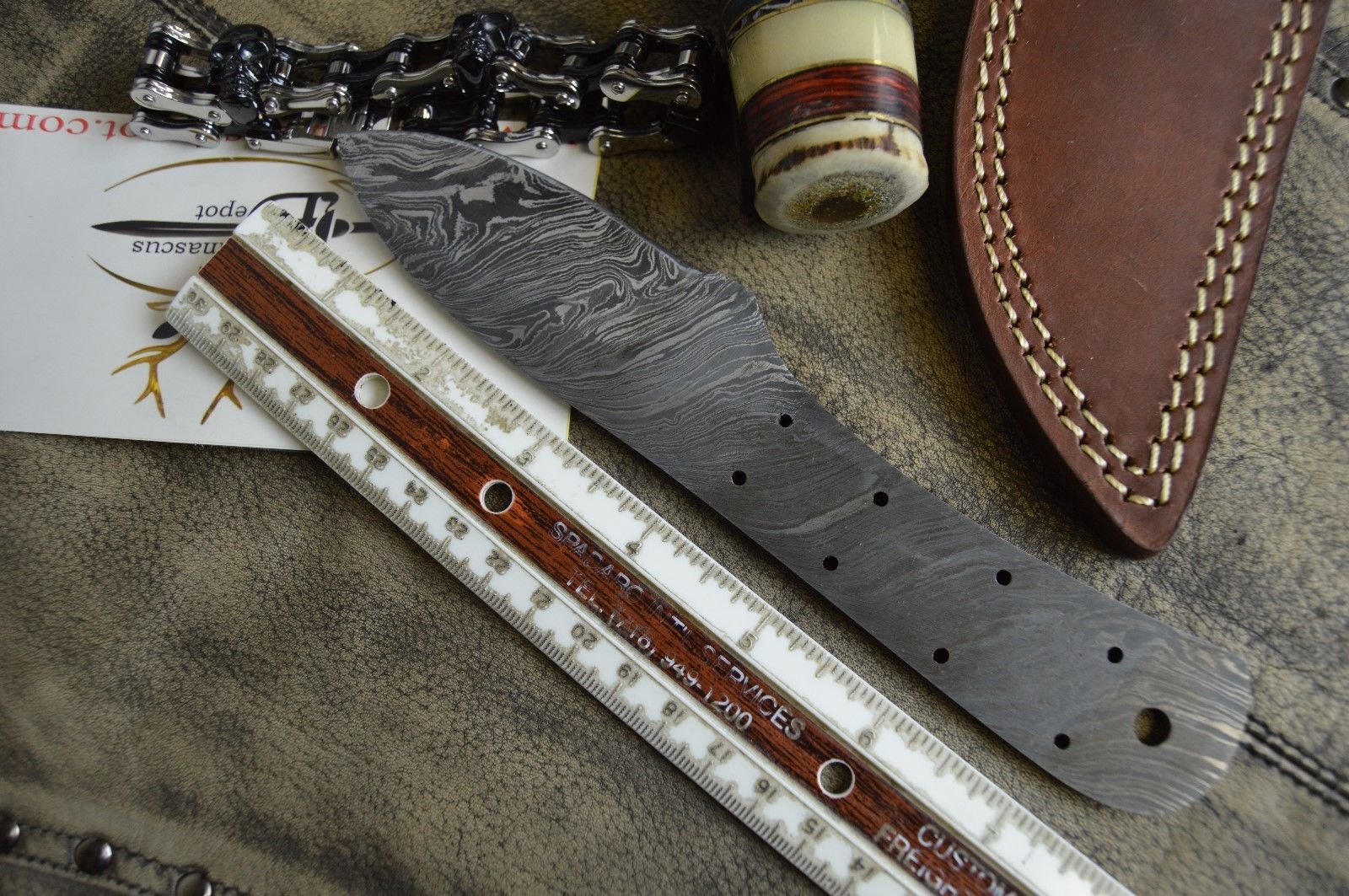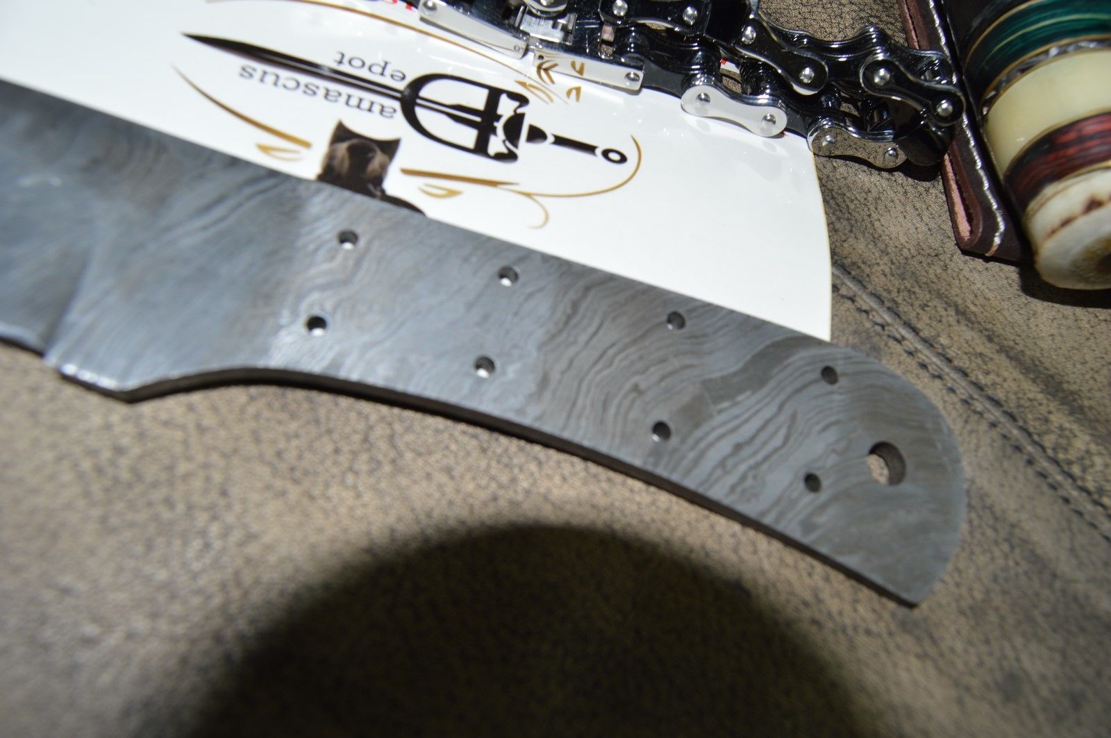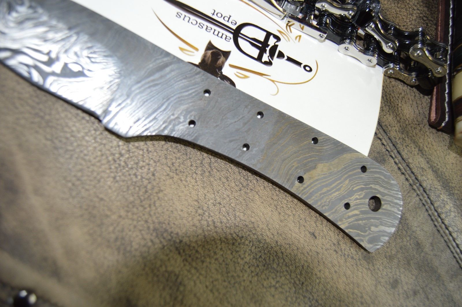 7.5" hand forged Damascus steel blank blade 3.25" cutting edge, 9 scale holes