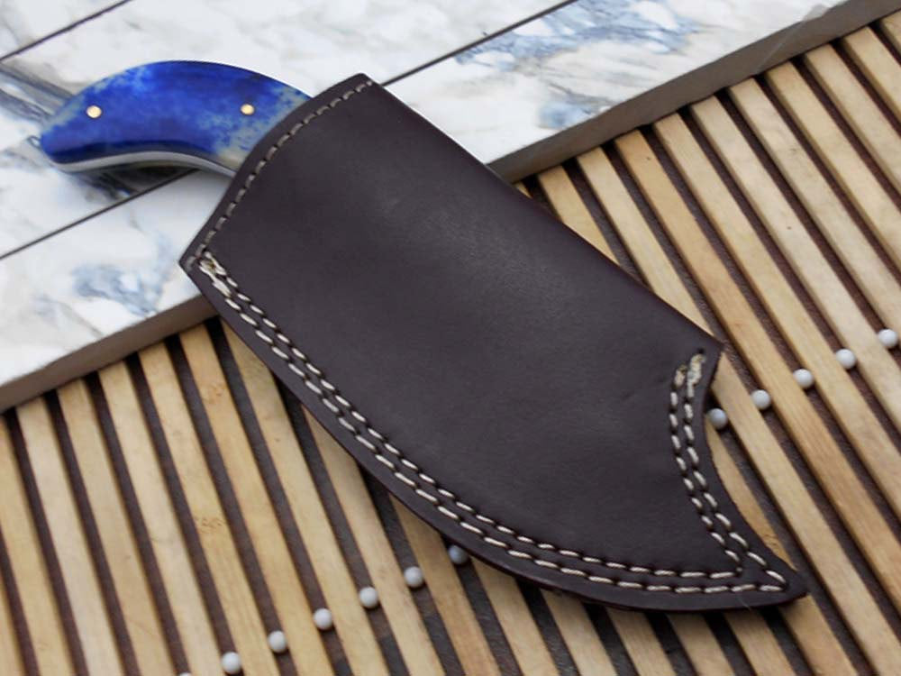 Never store your knife for long time in leather sheath. Leather can absorb water which will rust the knife. Always clean the blade after using and apply oil or wax (please use cooking oil on Chef Knife) before you store it, for its longer life and durability.