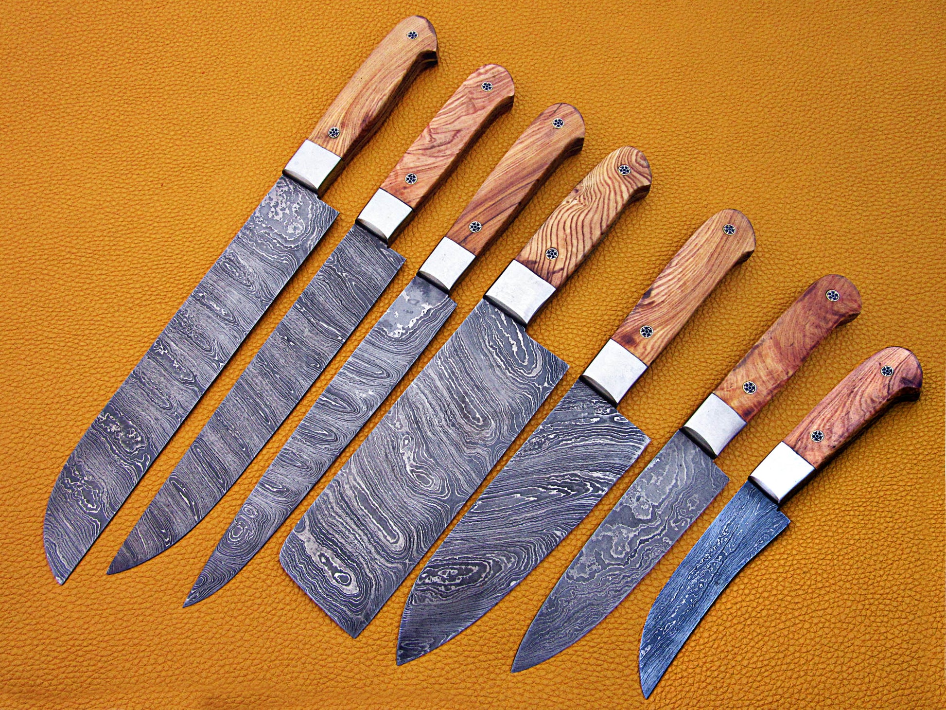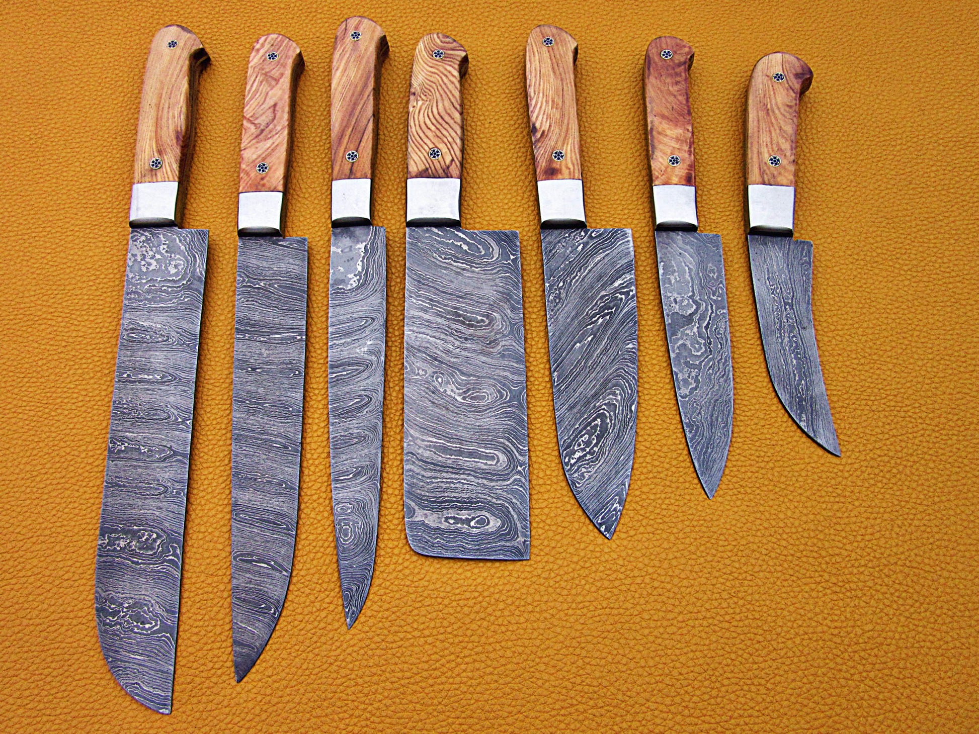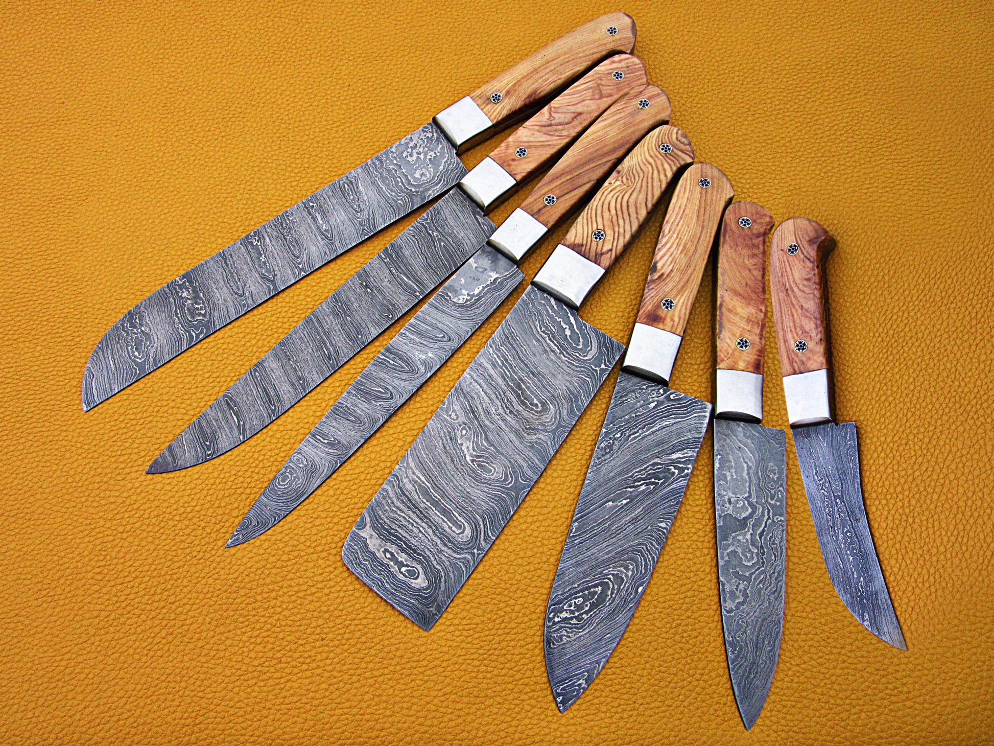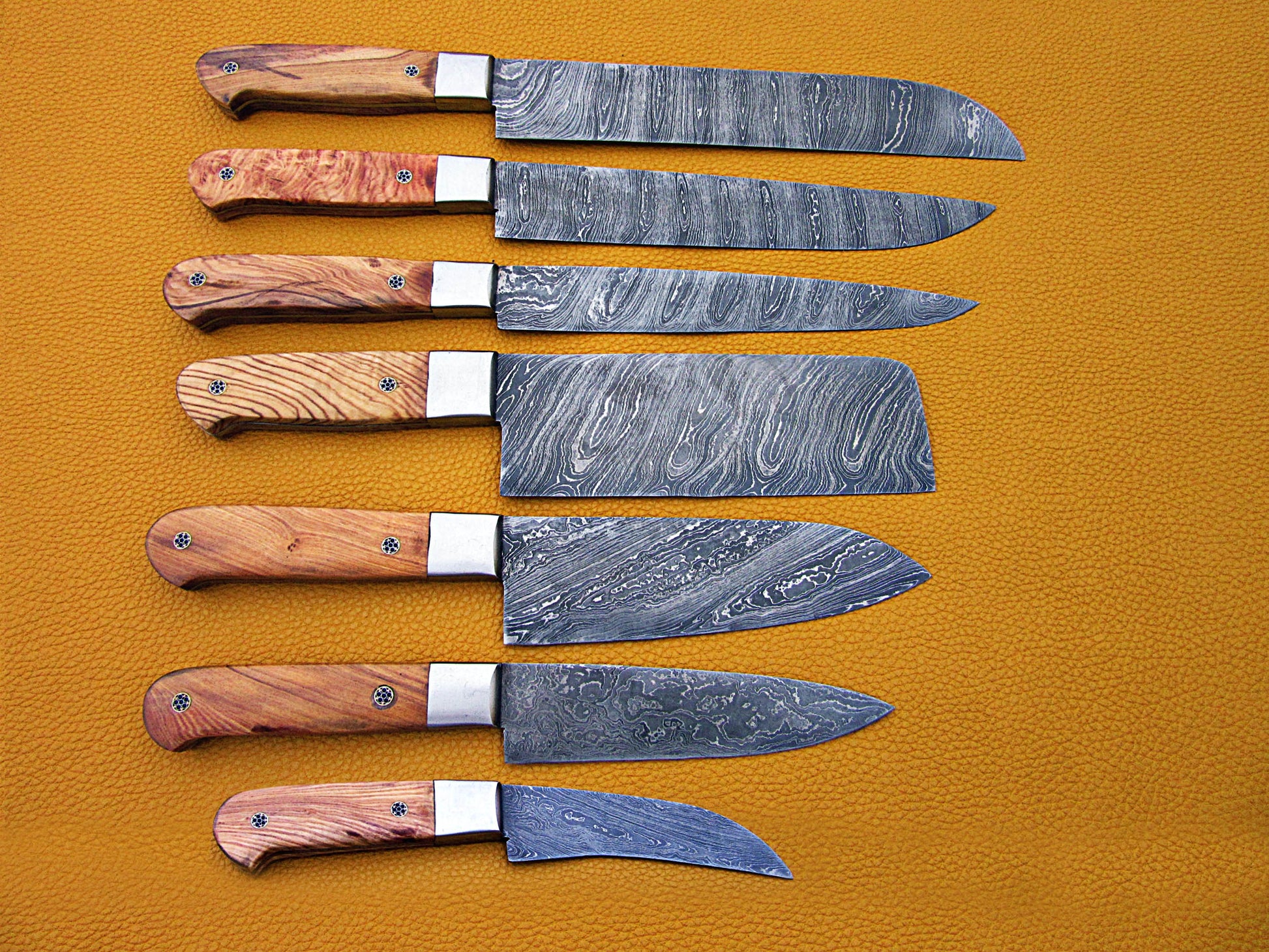 Natural wood scale with Brass Pipes and Brass Bolster Features: 10.6 + 9.6 + 9.0 + 8.0 + 7.6 inches 5 pieces chef knife set 6.10 + 5.5 + 5.0 + 4.0 + 3.10 inches cutting edge