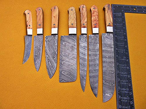 7 pieces Custom made hand forged Damascus steel full tang blade kitchen knife set, Over 75 inches Length of Damascus sharp knives (15+14+13.5+12+11+10+9) Inches, Cow hide Leather sheath