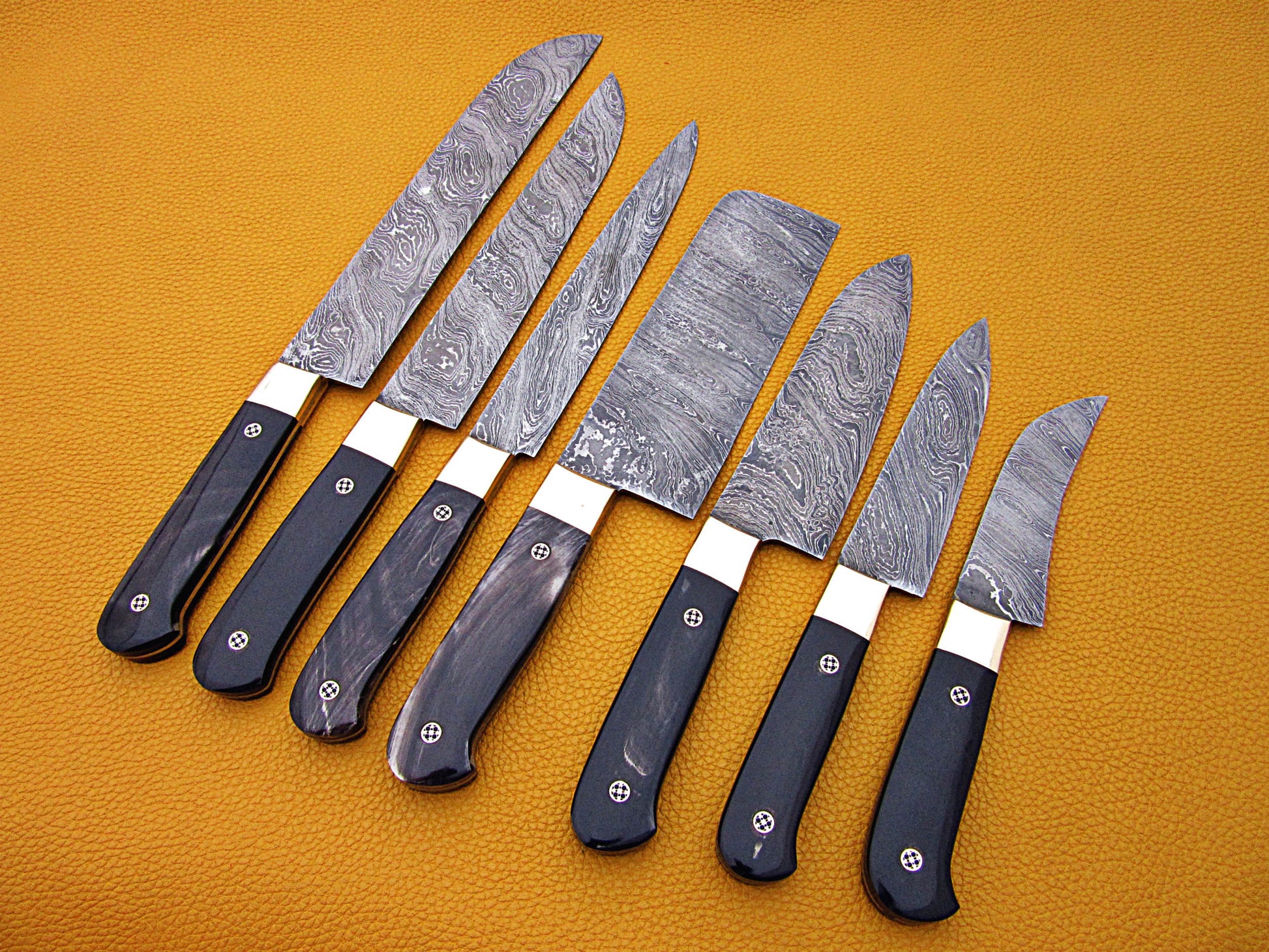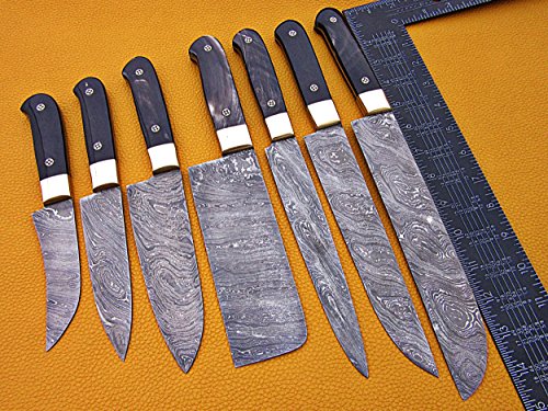7 pieces Custom made hand forged Damascus steel full tang blade kitchen knife set, Over 75 inches Length of Damascus sharp knives (15+14+13.5+12+11+10+9) Inches, Cow hide Leather sheath