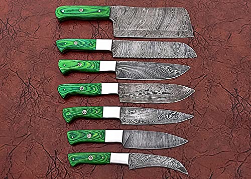 Overall 74 inches long 7 pieces kitchen knife set. Green Dollar wood scale with brass bolster. Scales are bling with 3 silver Pin and lace inserting hole. Hand forged Twist pattern Damascus steel blade. Up to the standard of Kitchen knife. Set includes Bread knife, Boning knife, slicing knife, cleaver, steak knife and utility knife. Comes with Goat suede Leather roll bag with custom sewn pockets of each knife size for easy carrying. Blade is made of Damascus steel by forging the 1095 and 15N20 high and low carbon steel with hundreds of layers folded Blade has been given an excellent heat treatment to get it well hardened Hardness 56 to 58 HRC. Tips to Care Damascus knife: Damascus steel as well as 1095 high carbon steel knives are different than some other common steel knives,because of its high carbon content they can be rusted if not care properly. If you have seen rust accidently then use WD40 to remove it Always clean the blade after using and apply oil or wax (please use cooking oil on Chef Knife) before you store it, for its longer life and durability.