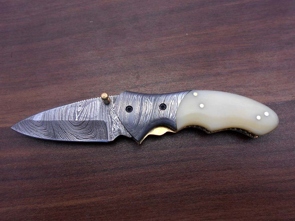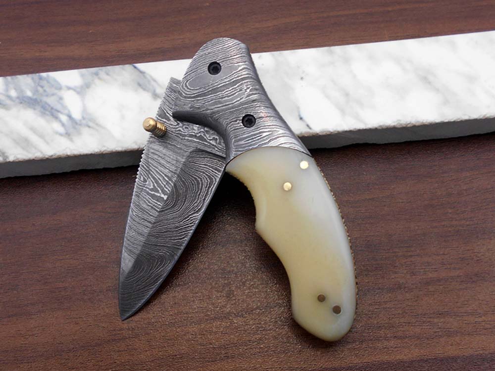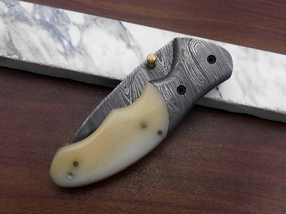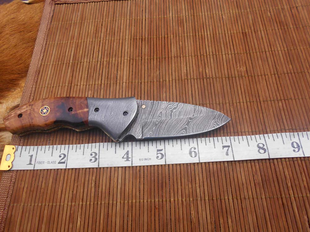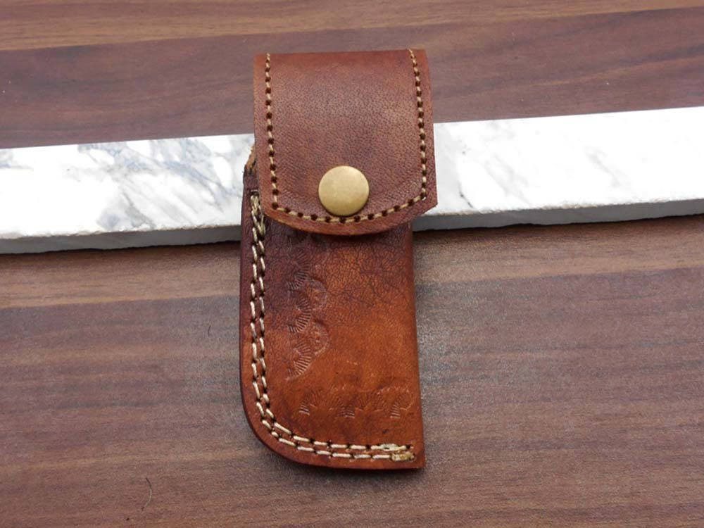 7"long Folding pocket Knife in 3 scale colors, 3" long Hand Forged Damascus steel legal blade, Various scales available, Cow hide leather sheath included