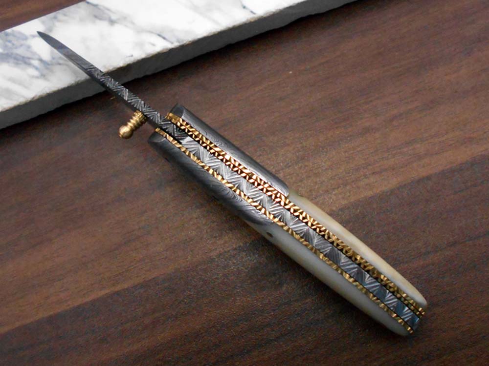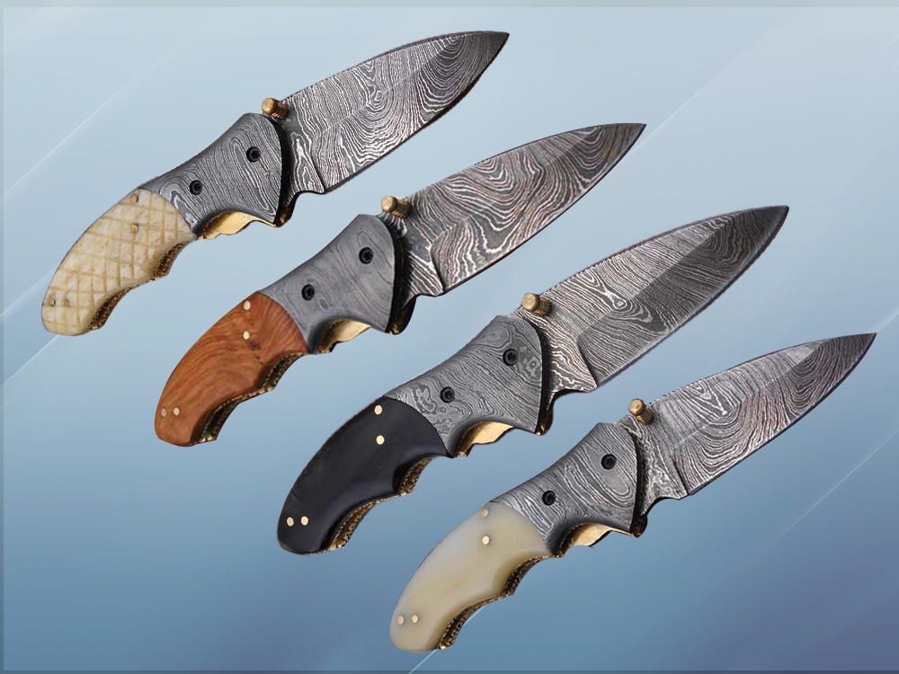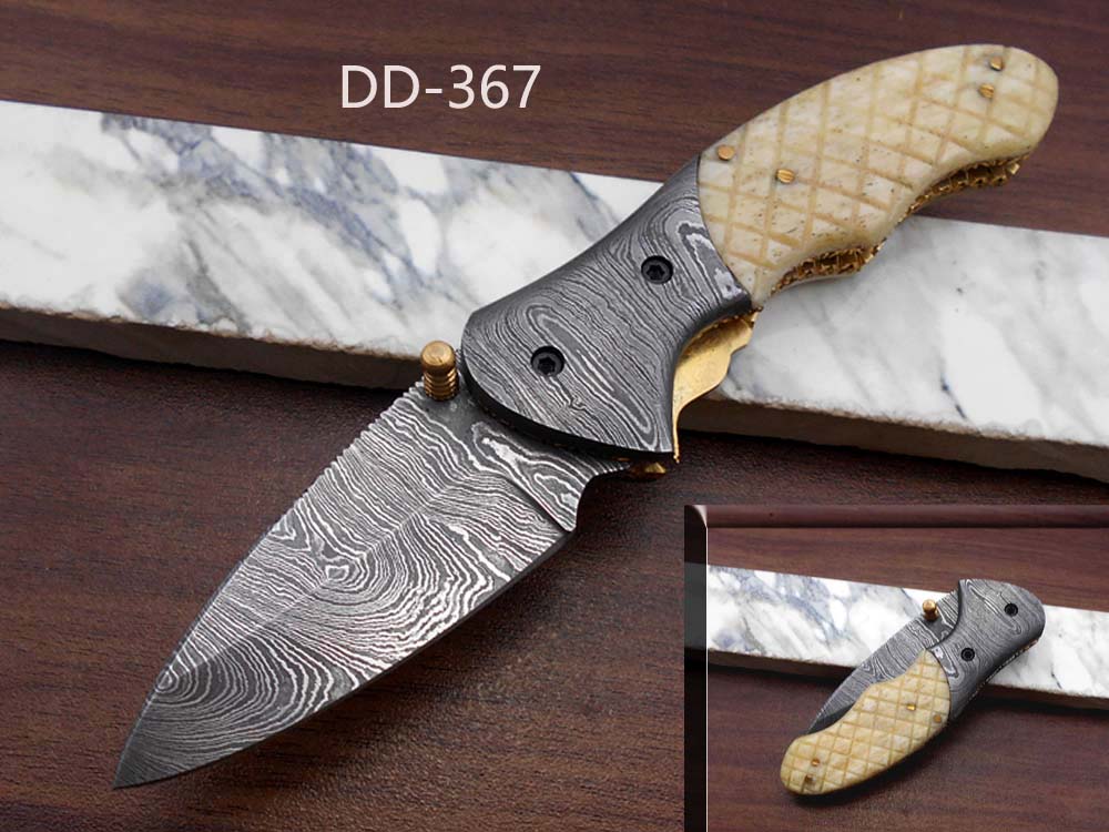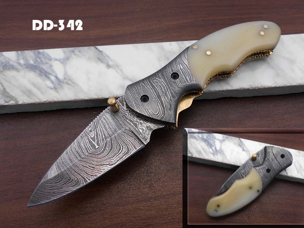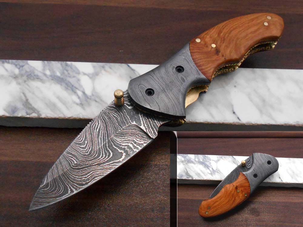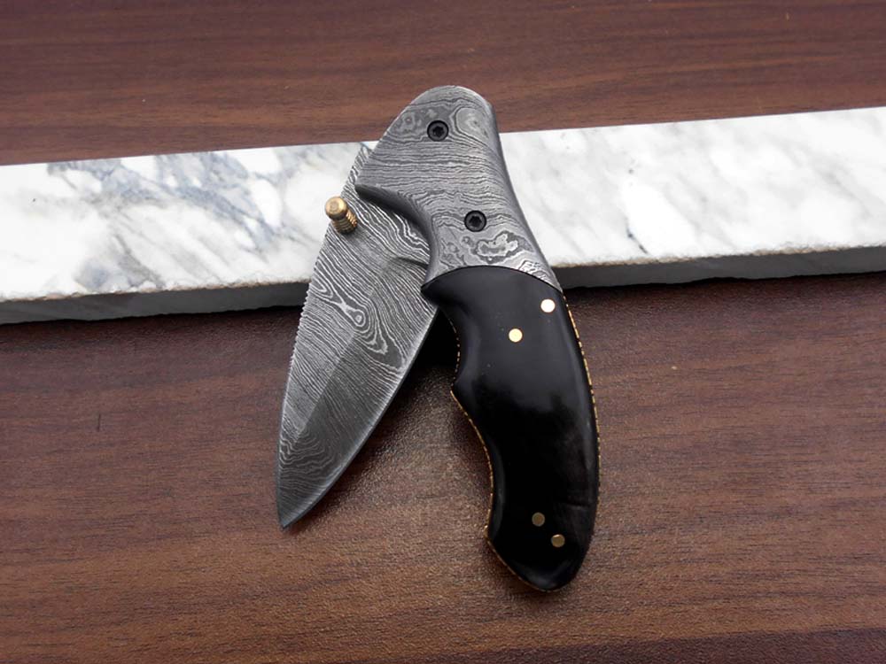 7"long Folding pocket Knife in 3 scale colors, 3" long Hand Forged Damascus steel legal blade, Various scales available, Cow hide leather sheath included