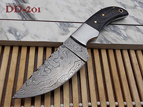 FEATURES: Micarta wood scale with steel bolster Scale is bling with 3 Brass pins and inserting hole Overall 8.25" Long full tang knife with 4.25" long blade, 3.25" cutting edge Full tang blades are considered as more durable and stronger then non full tang Handle Length is 4 inches including bolster Fire pattern Damascus steel Up to standard camping, compact, everyday knife Comes with a fine quality thick and robust leather sheath that can be worn on belt. Blade is made of Damascus steel by forging over 465 layers of 1095 and 15N20 high and low carbon steel. Blade has been given an excellent heat treatment to get it well hardened Hardness 56 to 58 HRC. Note: You will receive the same knife as shown in the pictures. Custom Made Only One Piece. Tips to Care Damascus knife: Damascus steel as well as 1095 high carbon steel knives are different than some other common steel knives,because of its high carbon content they can be rusted if not care properly. If you have seen rust accidentally then use WD40 to remove it Never store your knife for long time in leather sheath. Leather can absorb water which will rust the knife. Always clean the blade after using and apply oil or wax (please use cooking oil on Chef Knife) before you store it, for its longer life and durability. DISCLAIMER: Our knives are very sharp so open and use them very carefully. We are not responsible for any injuries associated with the use of our knives. Our products are intended for legal use only by responsible buyers. We will not sell our products to anyone under the age of 18.