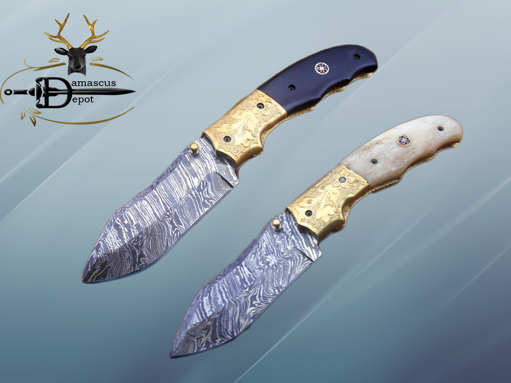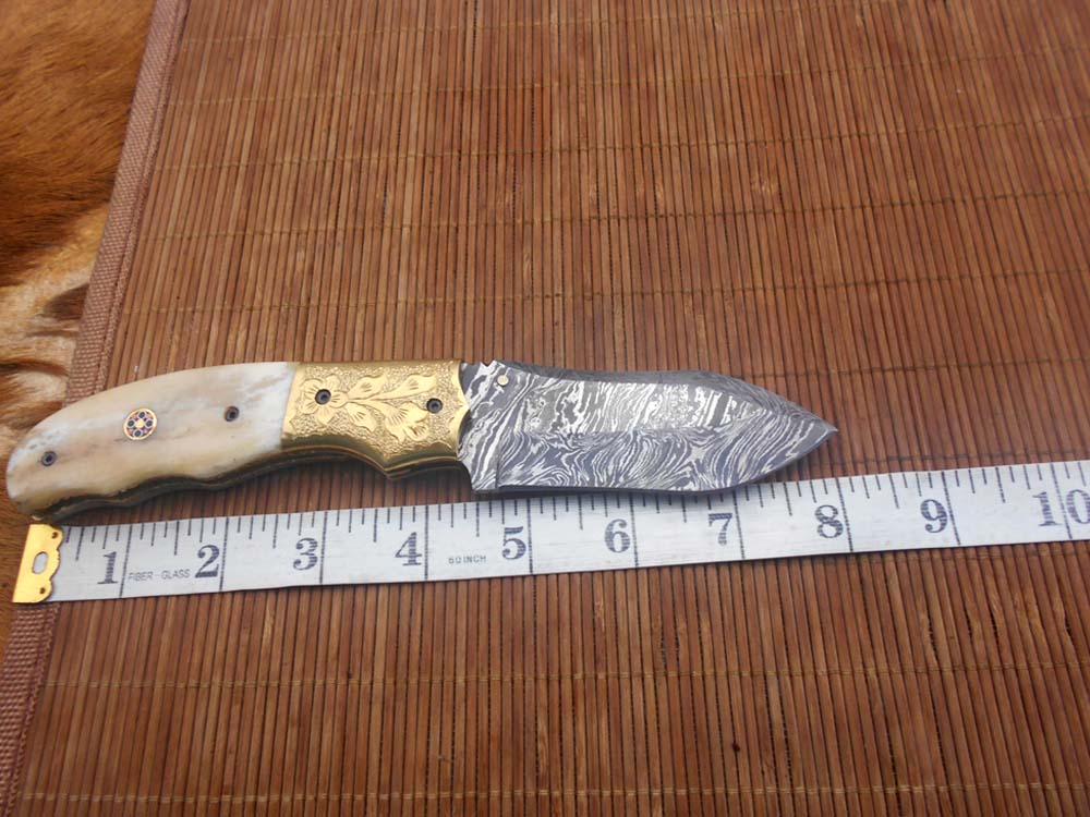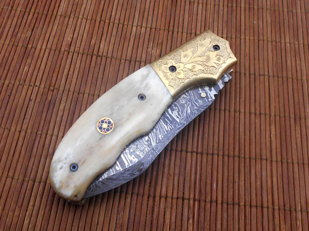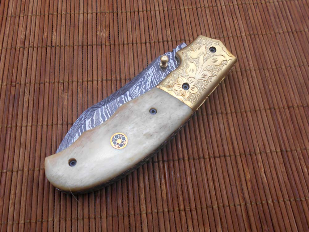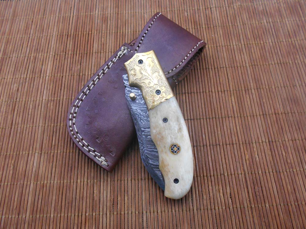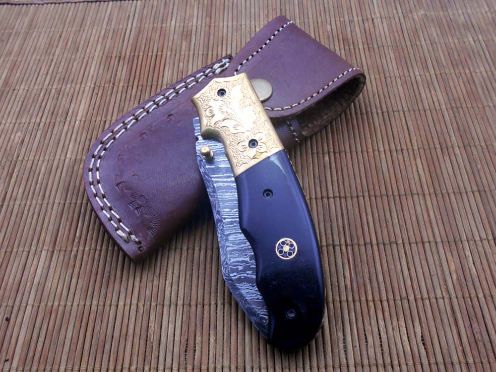 8" Damascus steel folding pocket knife with plant Engraved on brass bolster, White & black colors scale, included leather sheath