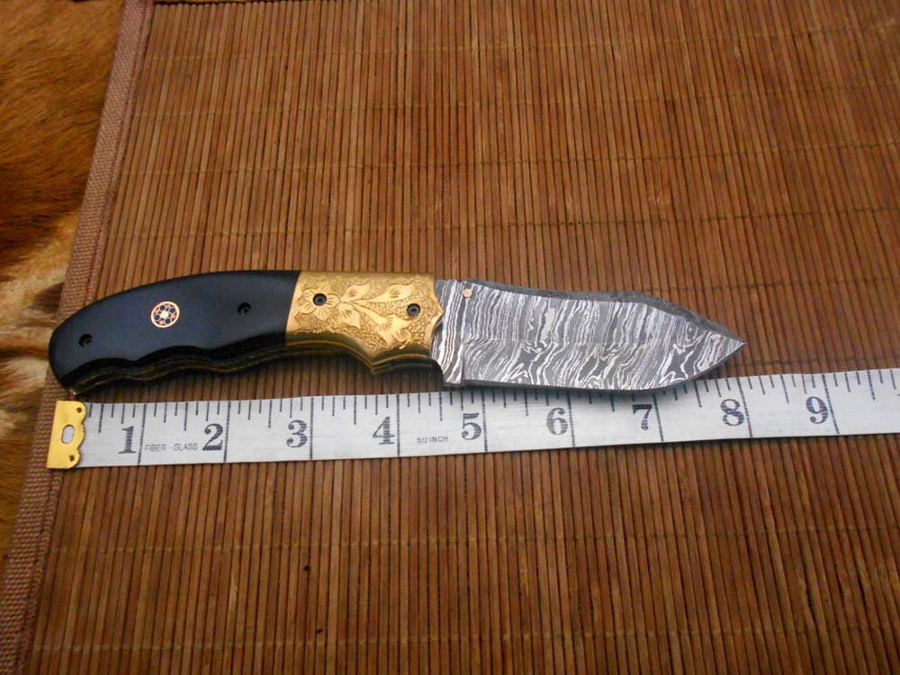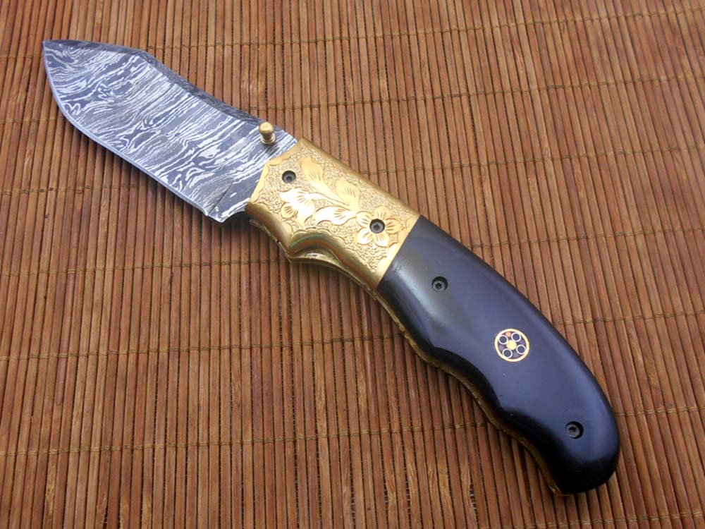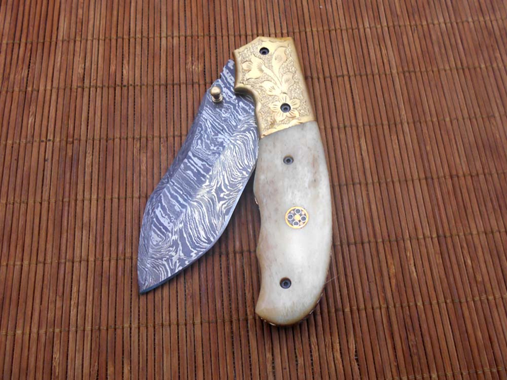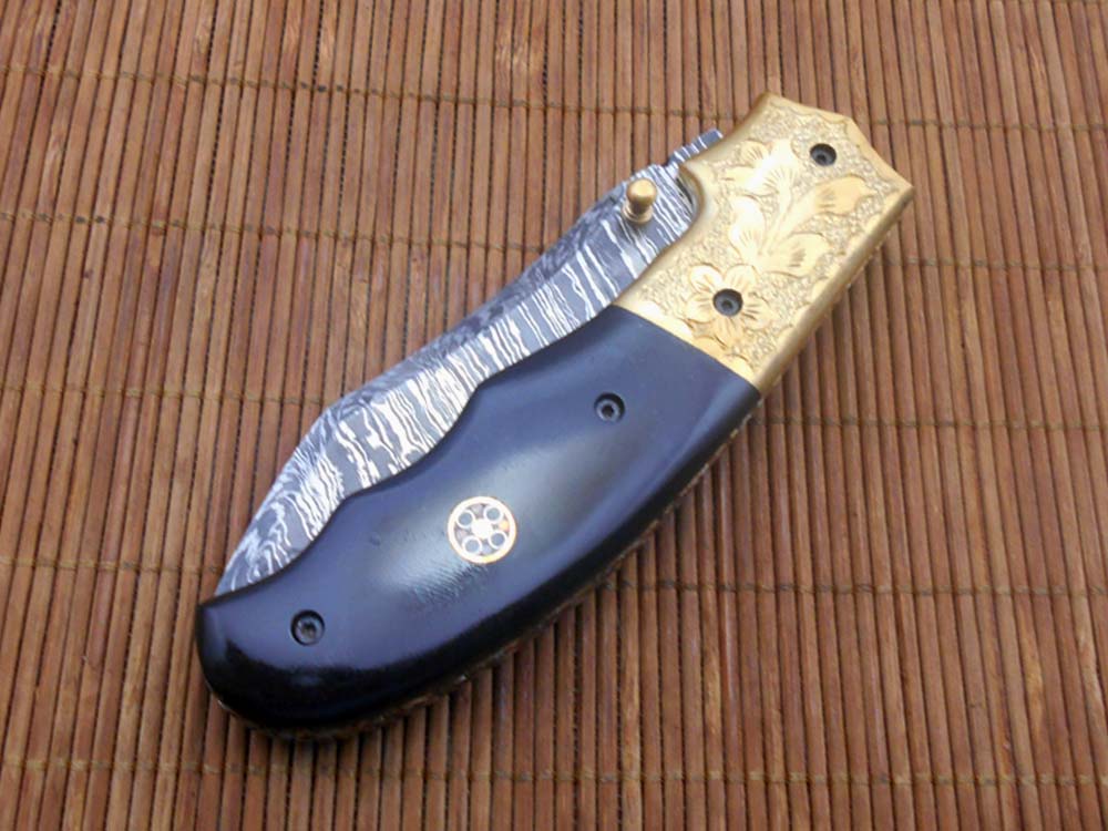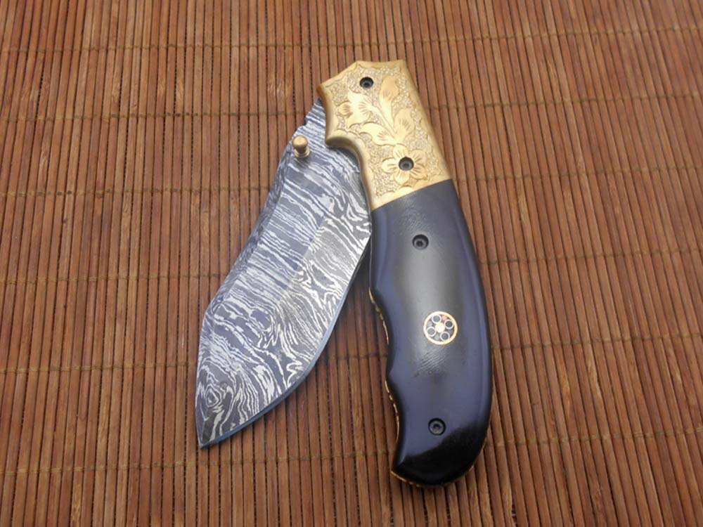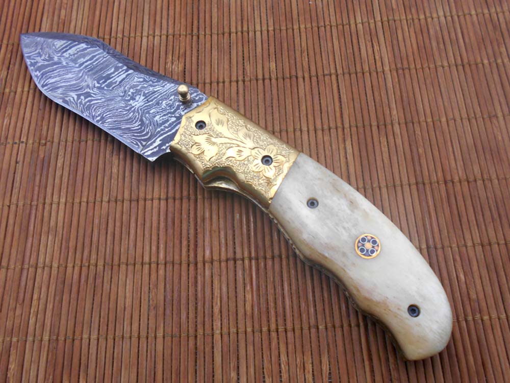 8" Damascus steel folding pocket knife with plant Engraved on brass bolster, White & black colors scale, included leather sheath