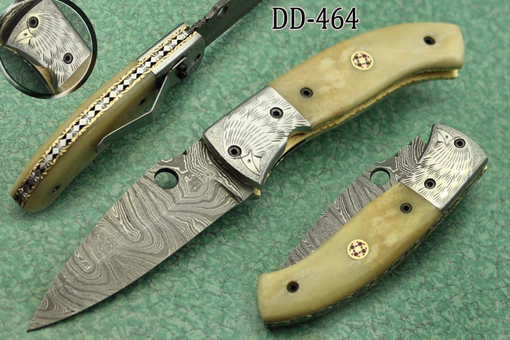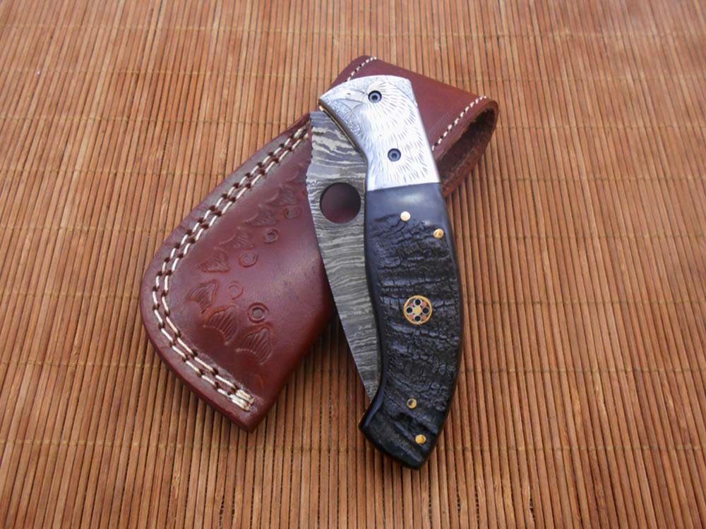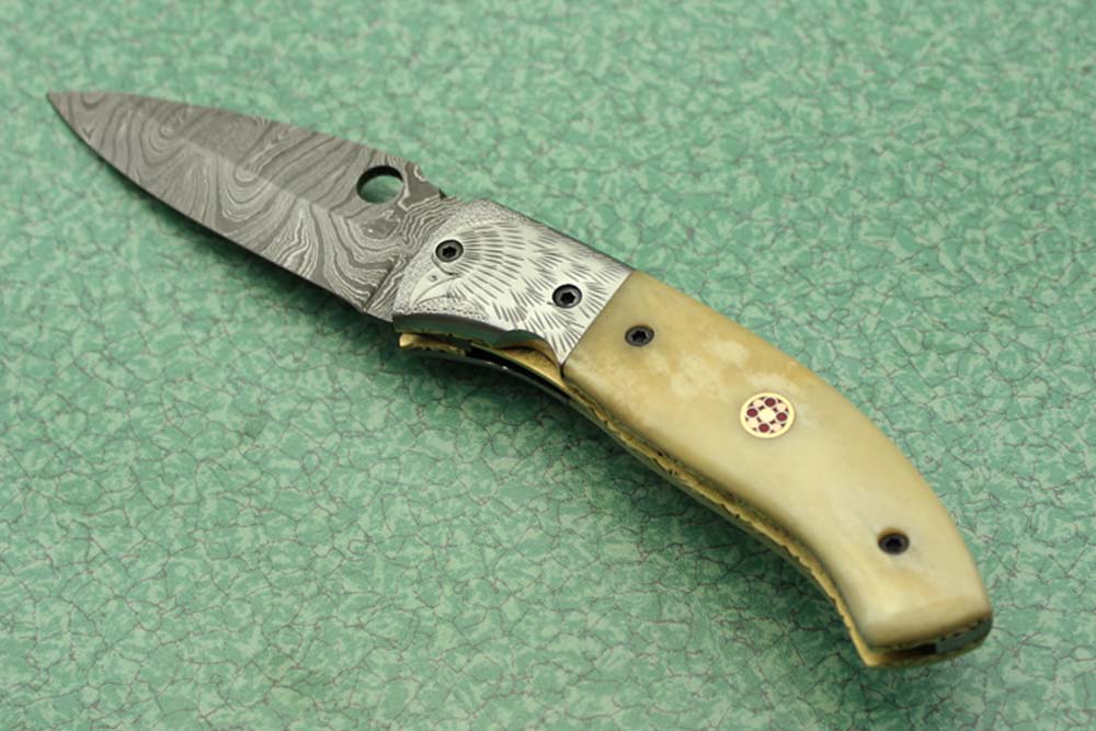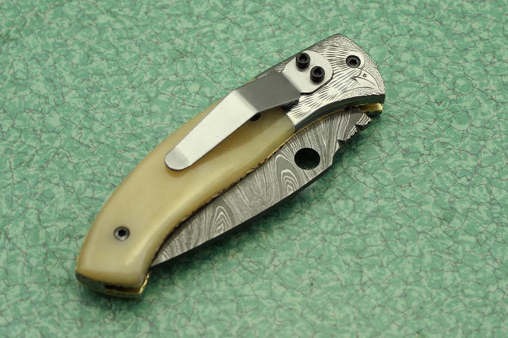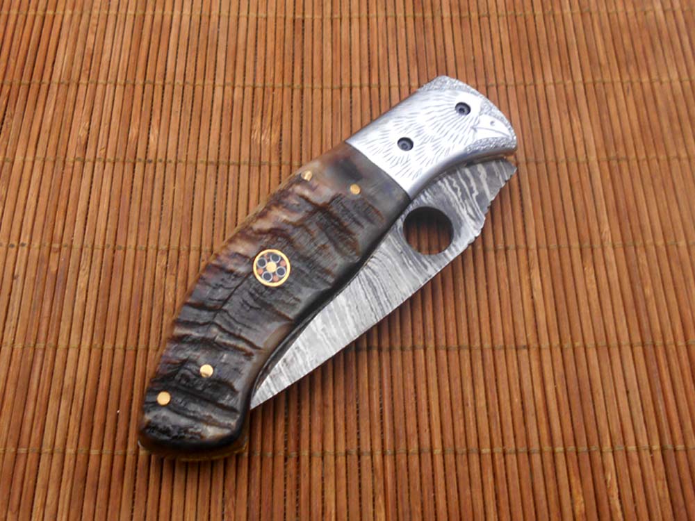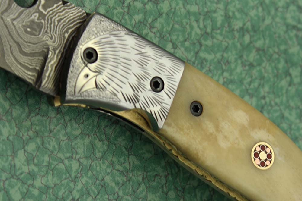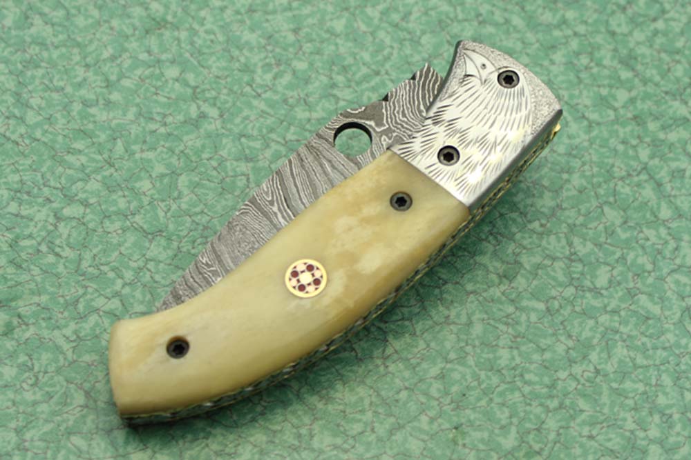 8" folding knife Damascus steel Engraved bird, liner lock, Horn & Bone scale