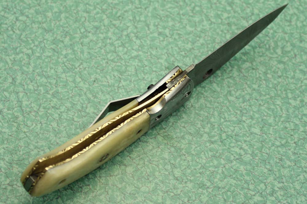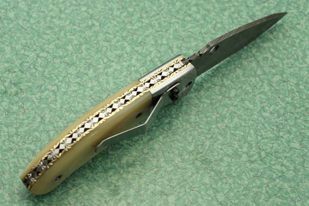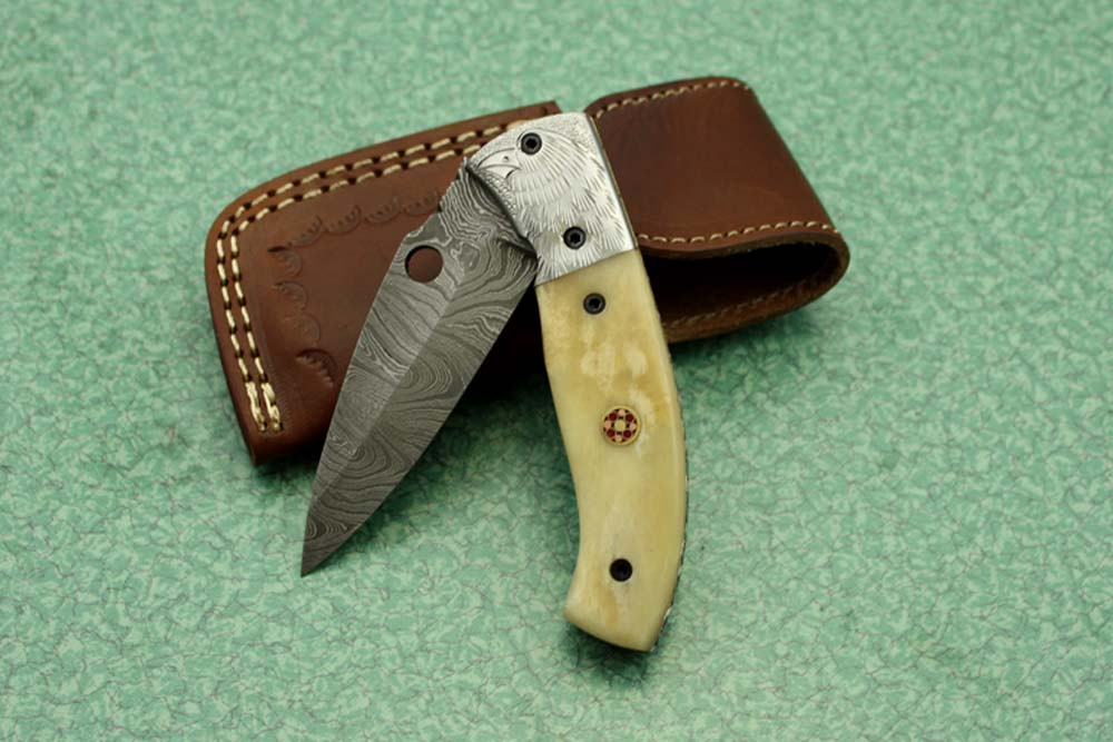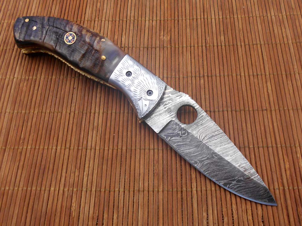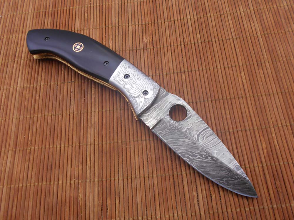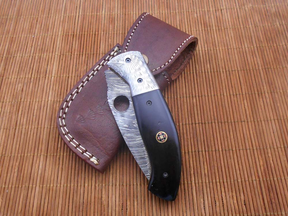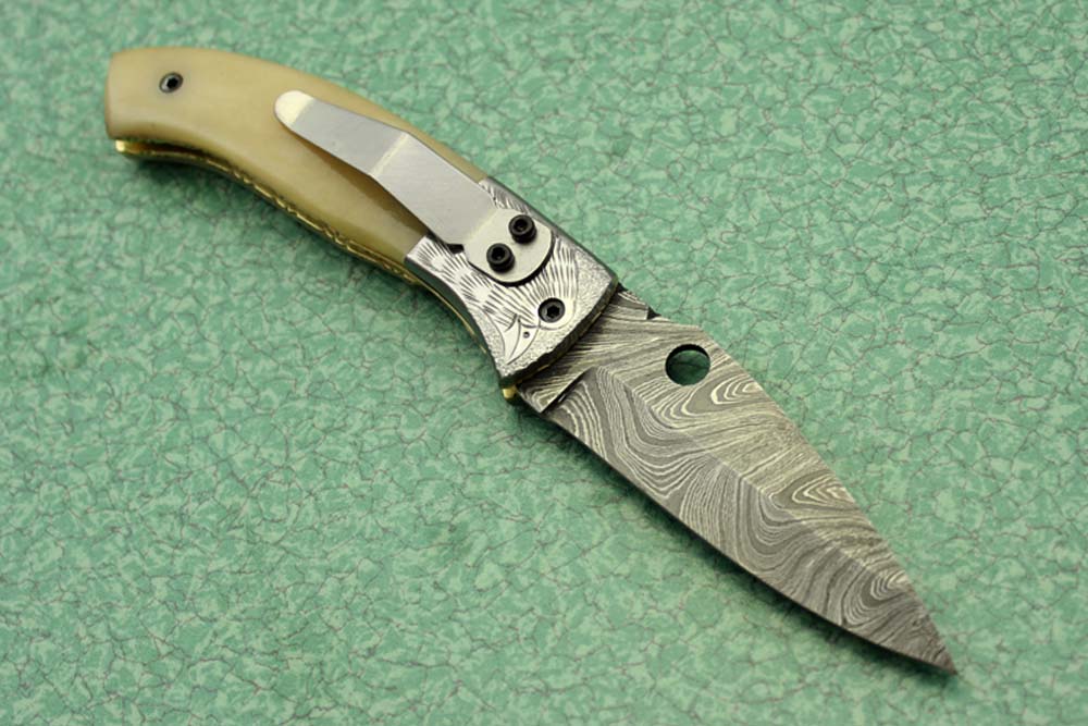 8" folding knife Damascus steel Engraved bird, liner lock, Horn & Bone scale