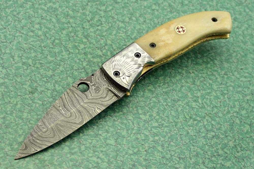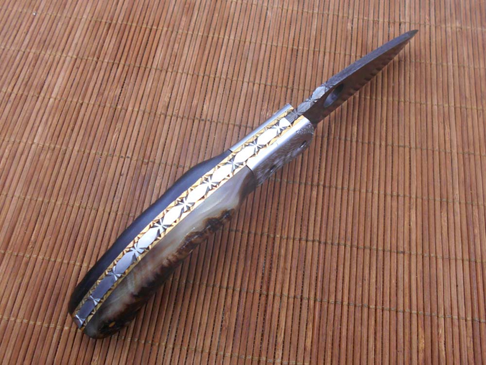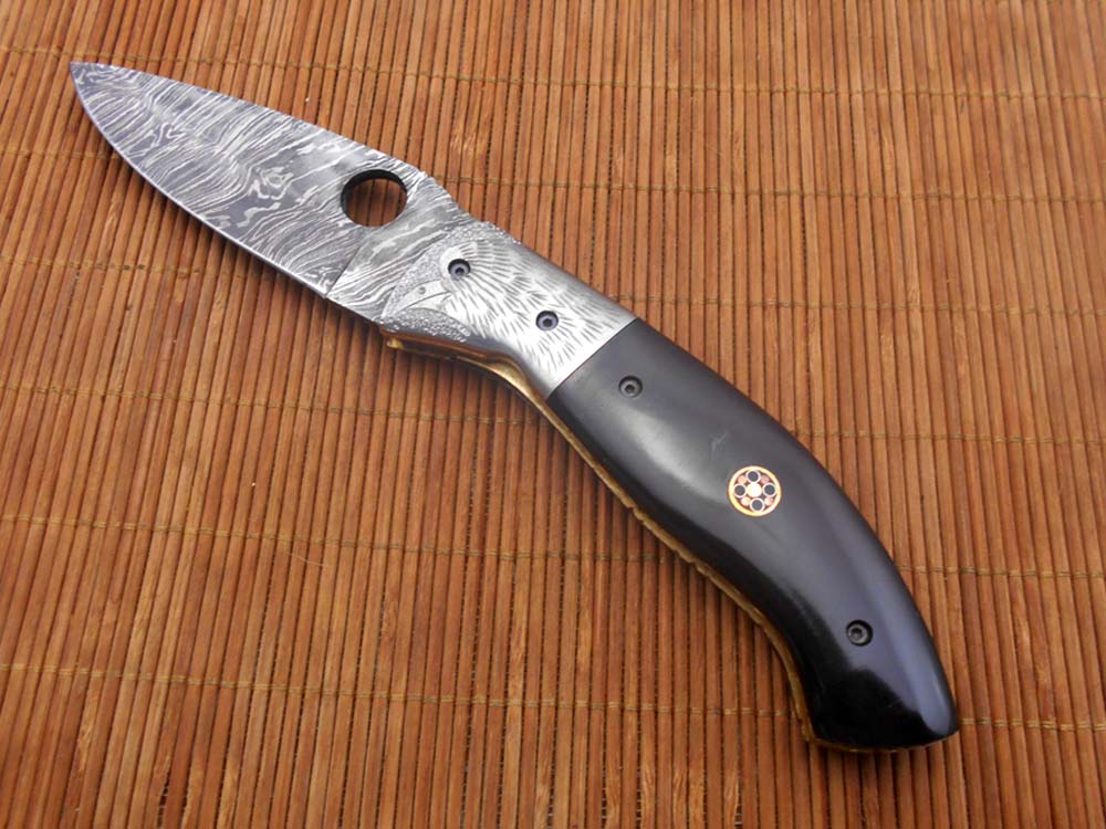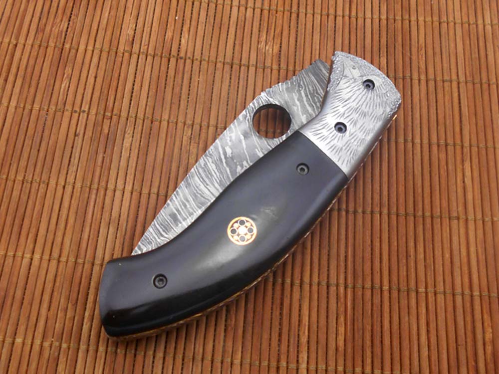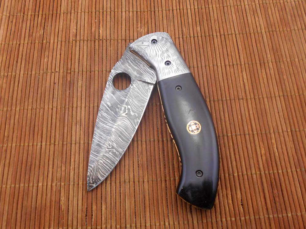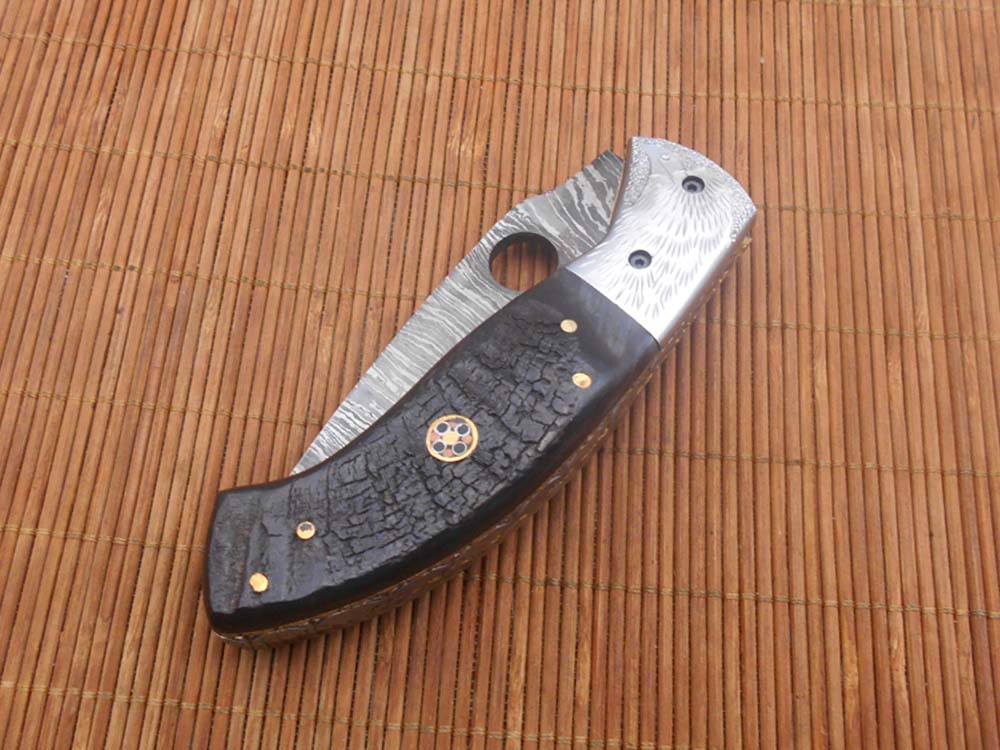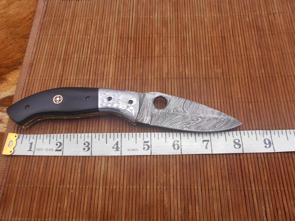 8" folding knife Damascus steel Engraved bird, liner lock, Horn & Bone scale