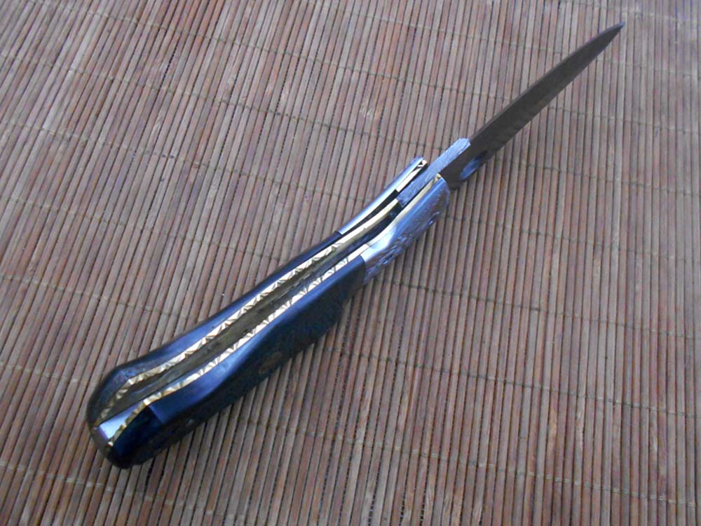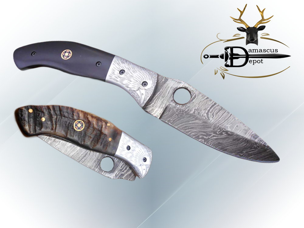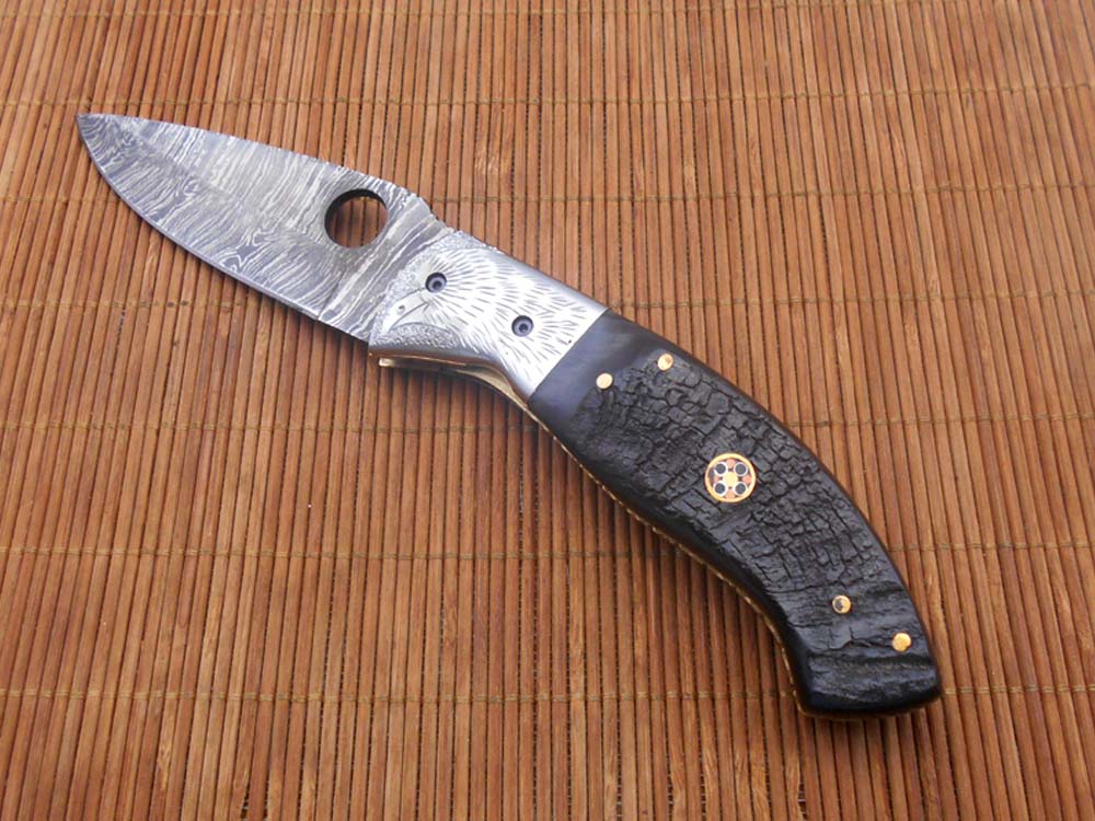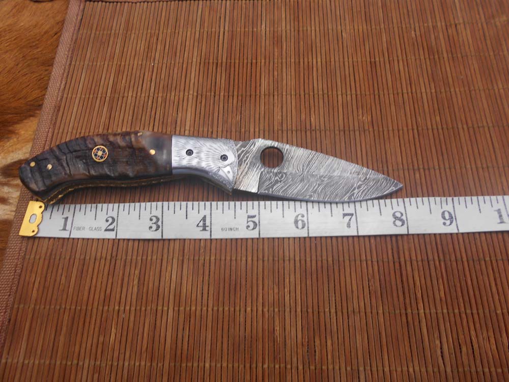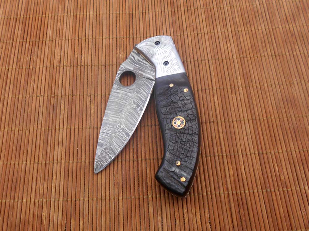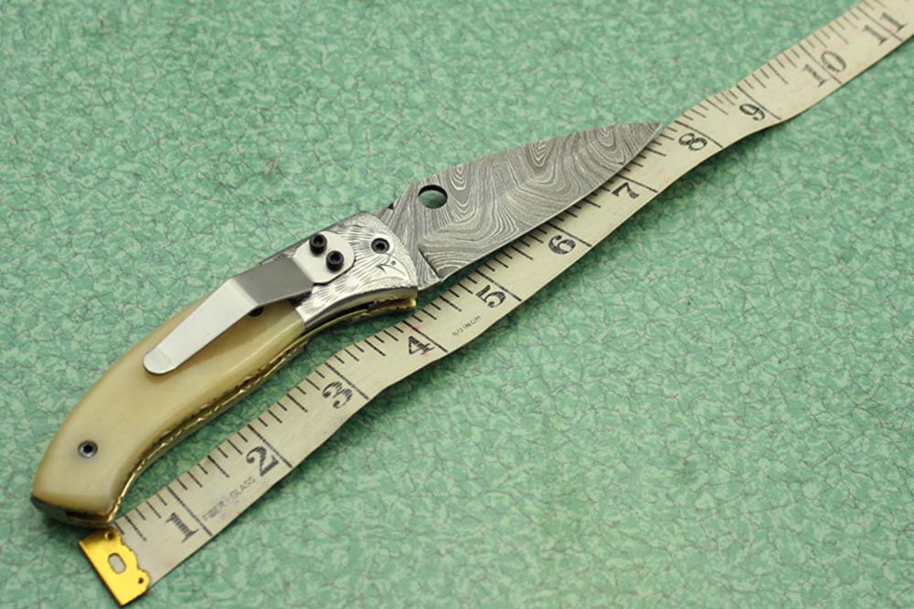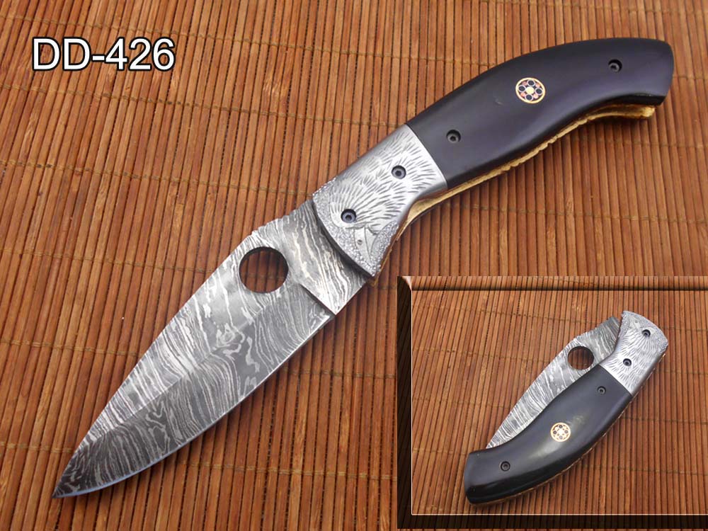 8" folding knife Damascus steel Engraved bird, liner lock, Horn & Bone scale
