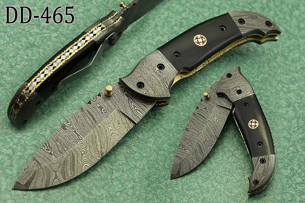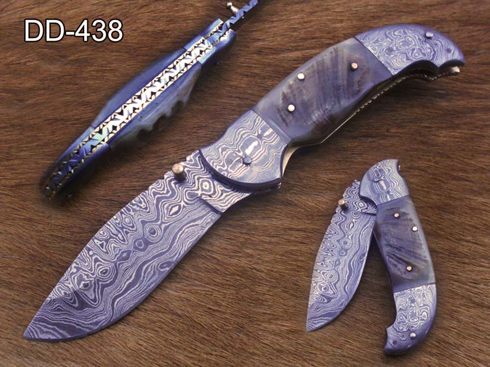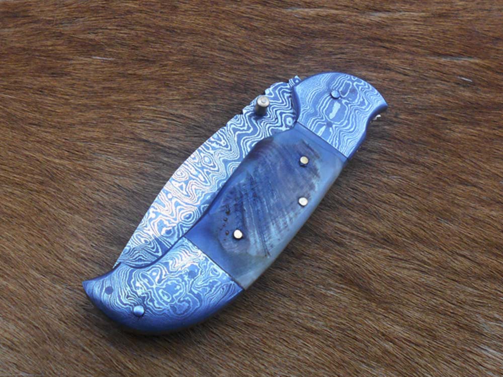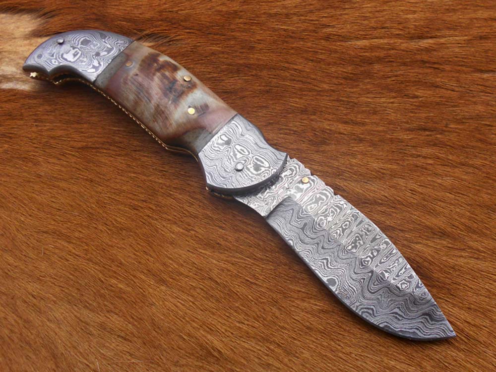 8 Inch Damascus steel folding knife, Available in Bone, Bull horn and Ram scales with Damascus bolster, Equipped with Thumb closing knob and liner lock, Cow hide Leather sheath with belt loop
