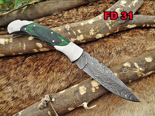 8" long Damascus steel Folding Knife, 2 Tone Green wood with Steel bolster scale, custom made 3.5" Hand Forged blade cow leather sheath