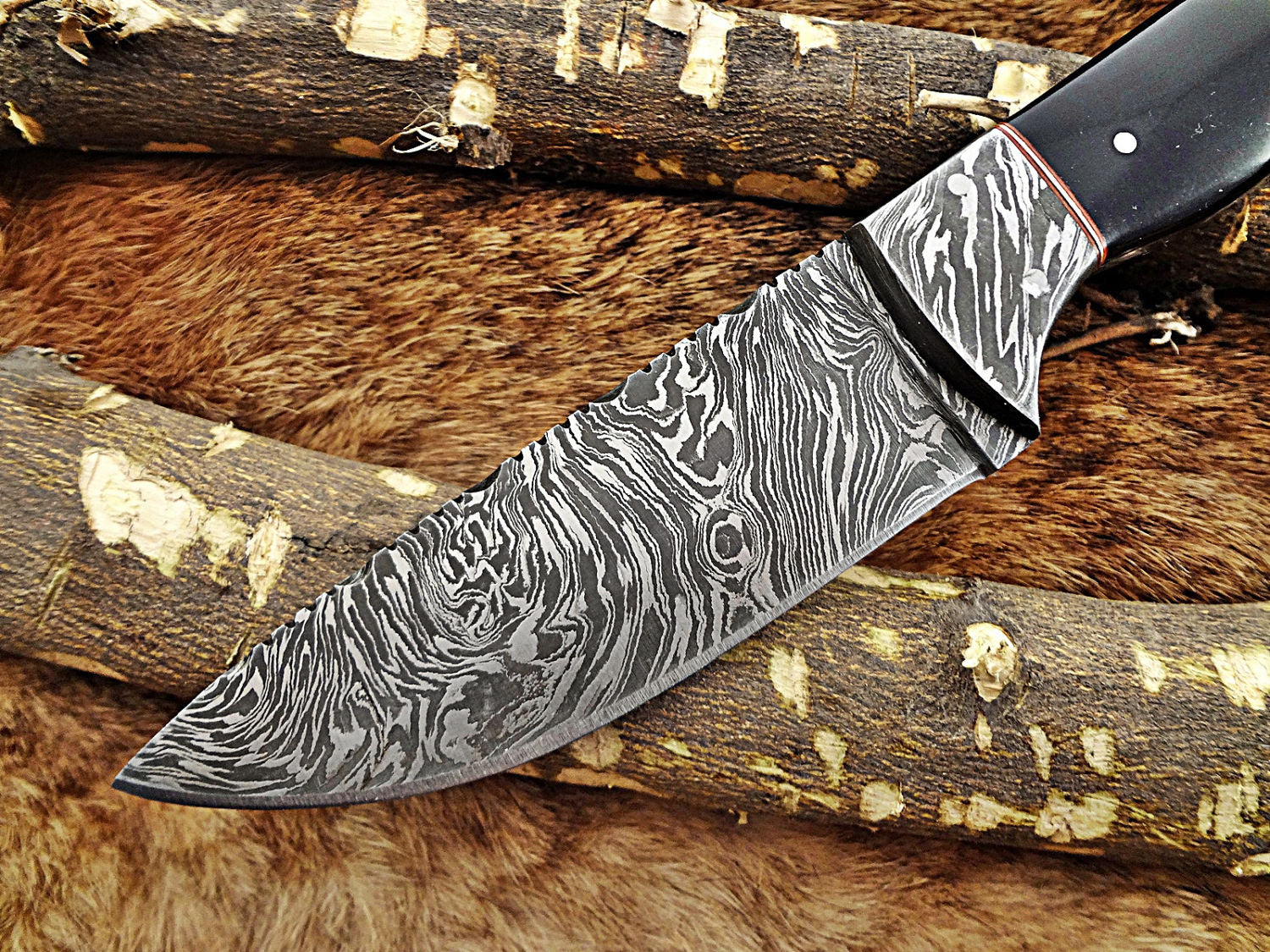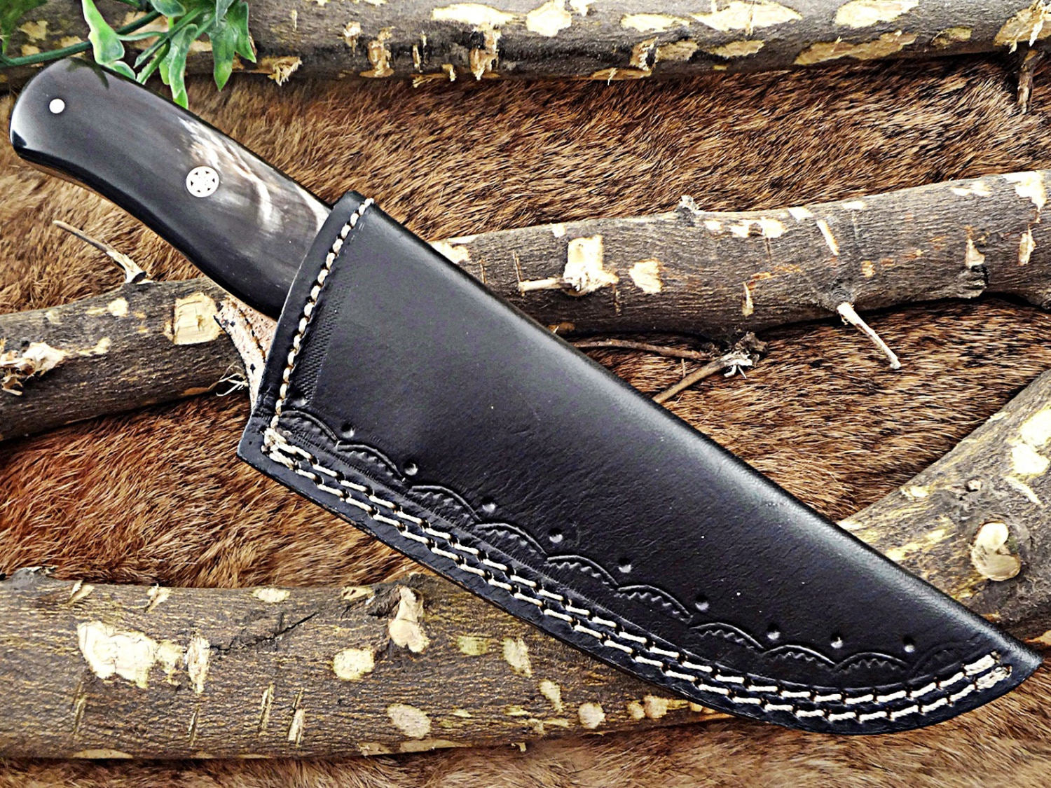 9.25" Long hand forged Damascus steel full tang drop point blade skinning Knife, Buffalo Horn scale with Damascus Bolster Cow Leather sheath