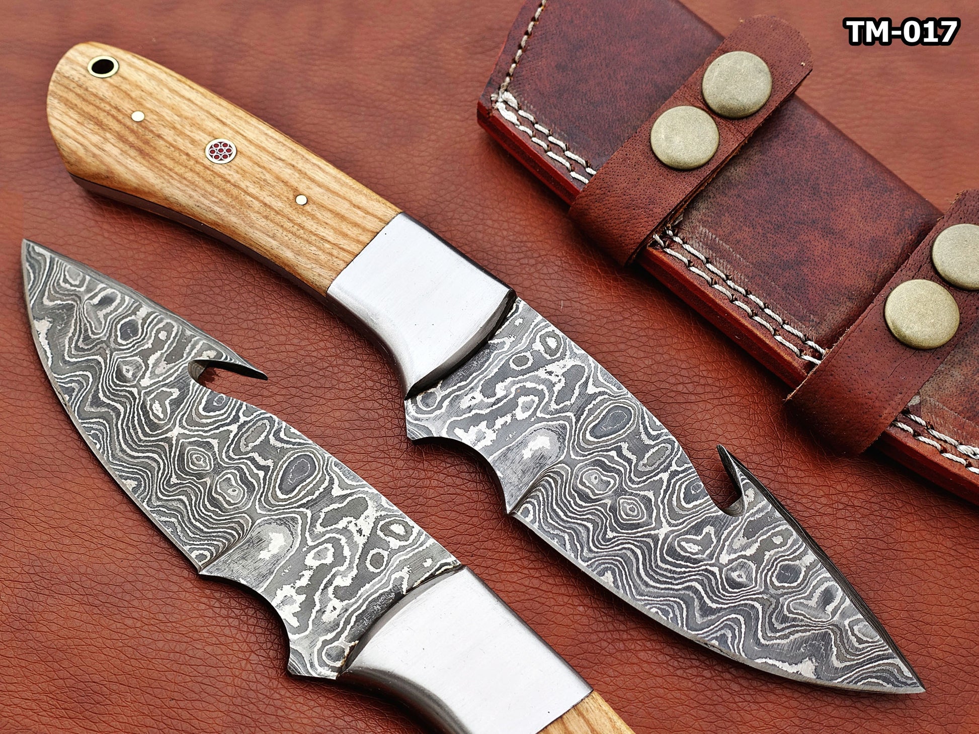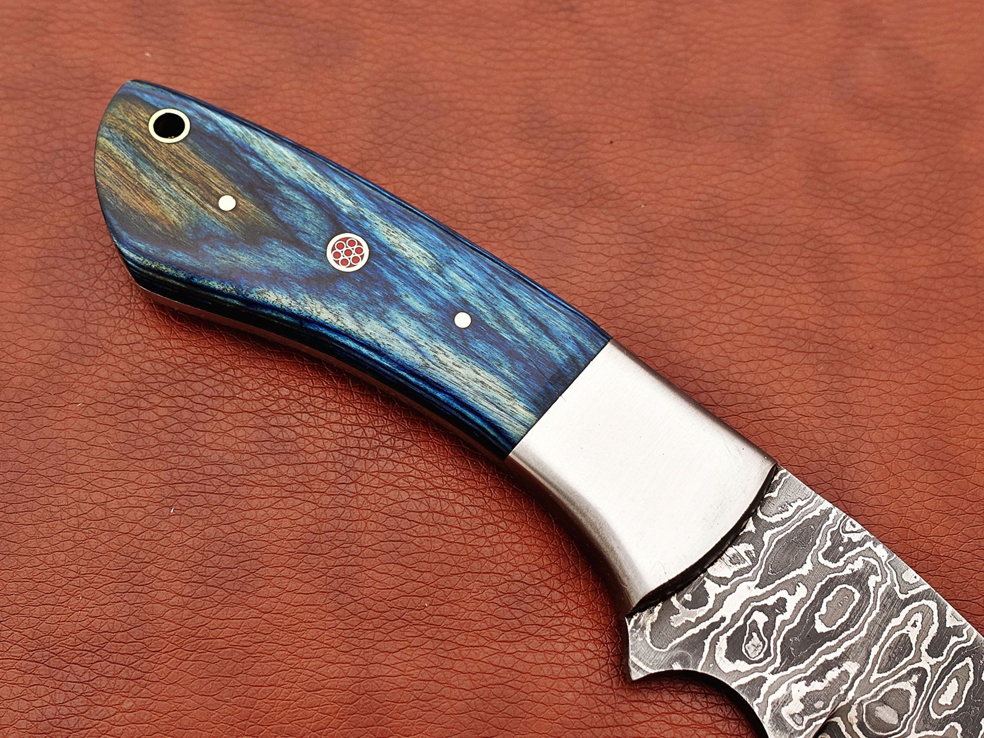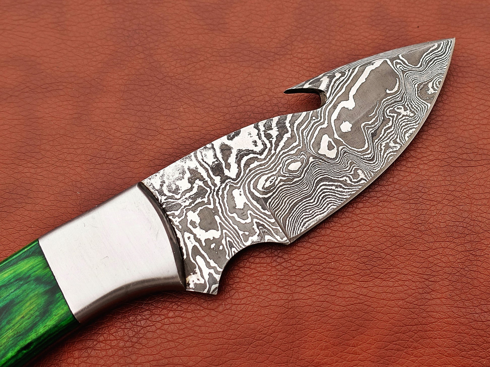 9.5" long Damascus steel Gut hook skinning knife, Full tang Rain drop pattern blade, available in 4 colors, includes Cow hide Leather sheath