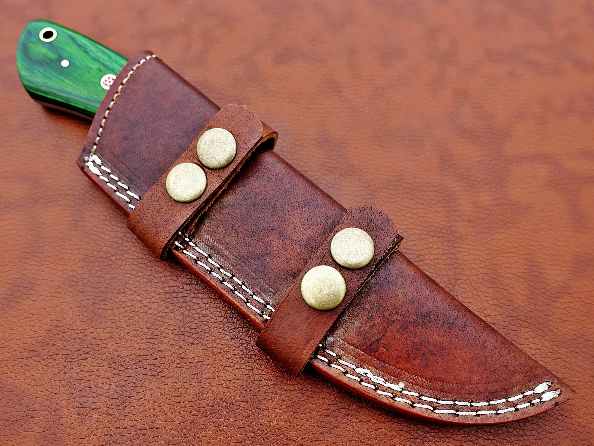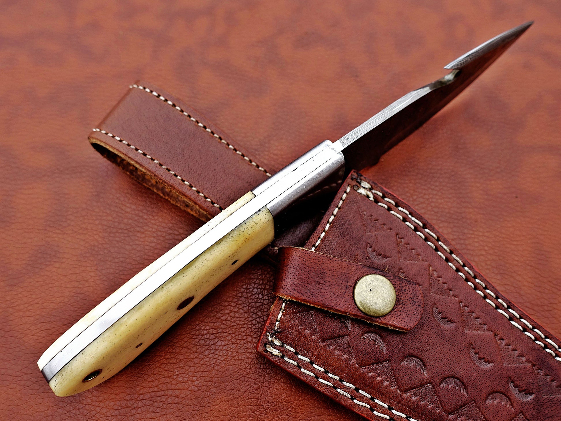 4.5″ long full tang blade with gut hook feature.Available in white Camel bone, Green, Blue and Yellow wood Scales5″ long full hand flat Scale with solid steel Bolster