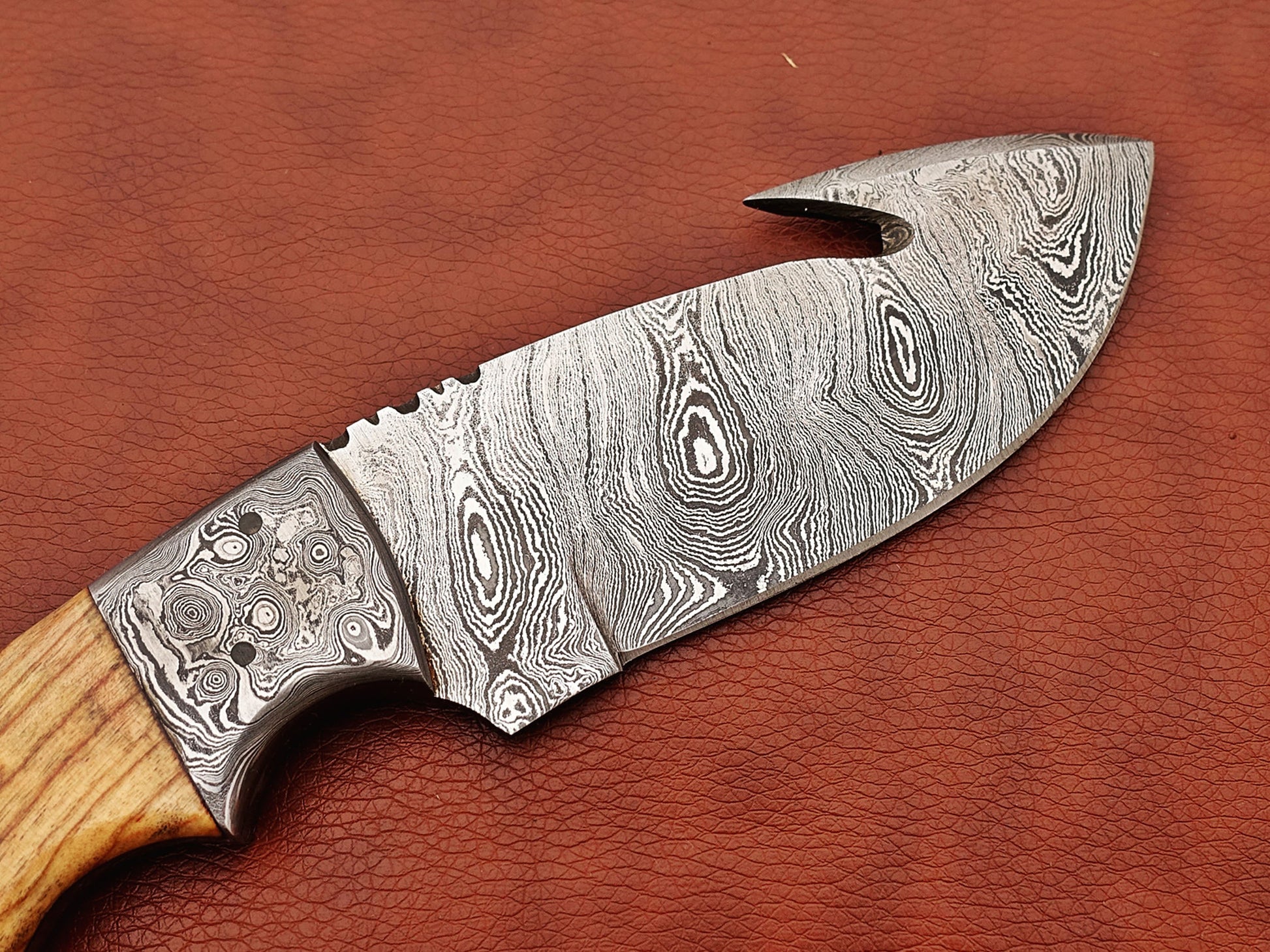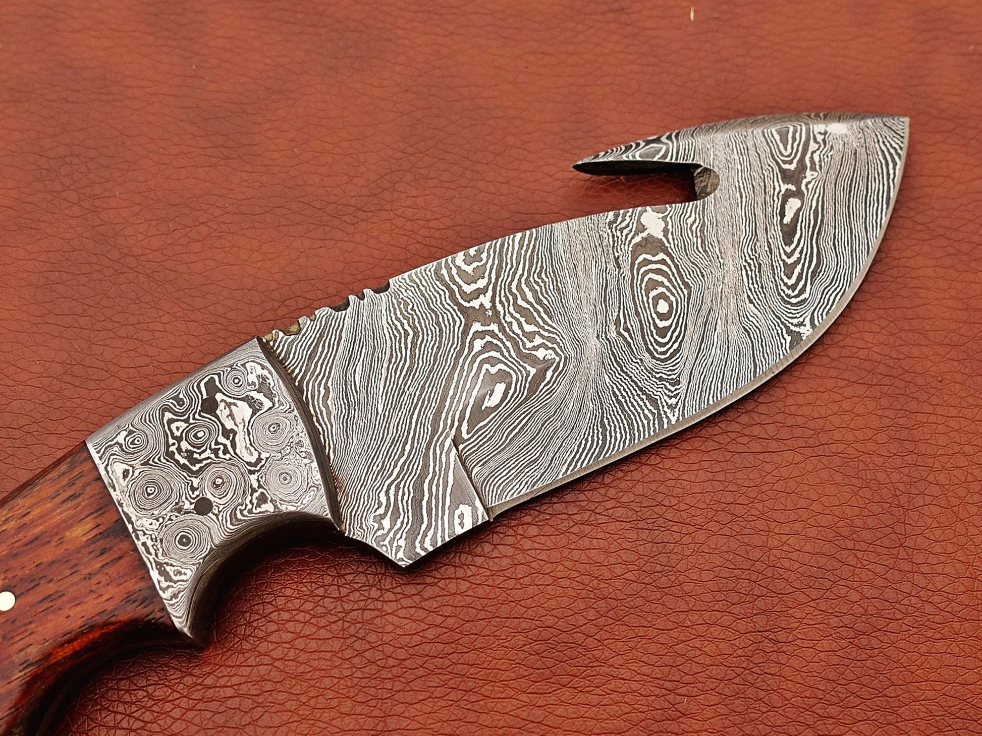 9.5" long Damascus steel Rain drop pattern Gut hook skinning knife, Full tang blade available in 4 colors, includes Cow hide Leather sheath