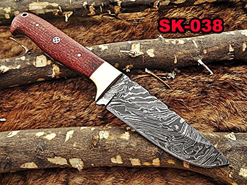Features: Red Micarta wood scale with Brass bolster 4.5" long Scale is bling with a Mosaic, 2 Brass pins and an inserting hole for extra strength Overall 9" Long with 4" long full tang blade Full tang blades are considered stronger and durable then non full tang Approximately 5 mm Thick Twist pattern Damascus steel drop point blade Up to standard hunting and skinning Knife Comes with a fine quality extra thick and robust leather sheath. The sheath has belt inserting loop and can be worn on belt. Blade is made of Damascus steel by forging the 1095 and 15N20 high and low carbon steel Our Damascus steel is prepared by forging over 465 layer of high carbon and low carbon steel. Blade has been given an excellent heat treatment to get it well hardened Hardness 56 to 58 HRC. If you want more information, OR have queries, please contact us without any hesitation. Tips to Care Damascus knife: Damascus steel as well as 1095 high carbon steel knives are different than some other common steel knives,because of its high carbon content they can be rusted if not care properly. If you have seen rust accidentally then use WD40 to remove it Never store your knife for long time in leather sheath. Leather can absorb water which will rust the knife. Always clean the blade after using and apply oil or wax (please use cooking oil on Chef Knife) before you store it, for its longer life and durability. DISCLAIMER: Our knives are very sharp so open and use them very carefully. We are not responsible for any injuries associated with the use of our knives. Our products are intended for legal use only by responsible buyers. We will not sell our products to anyone under the age of 18.
