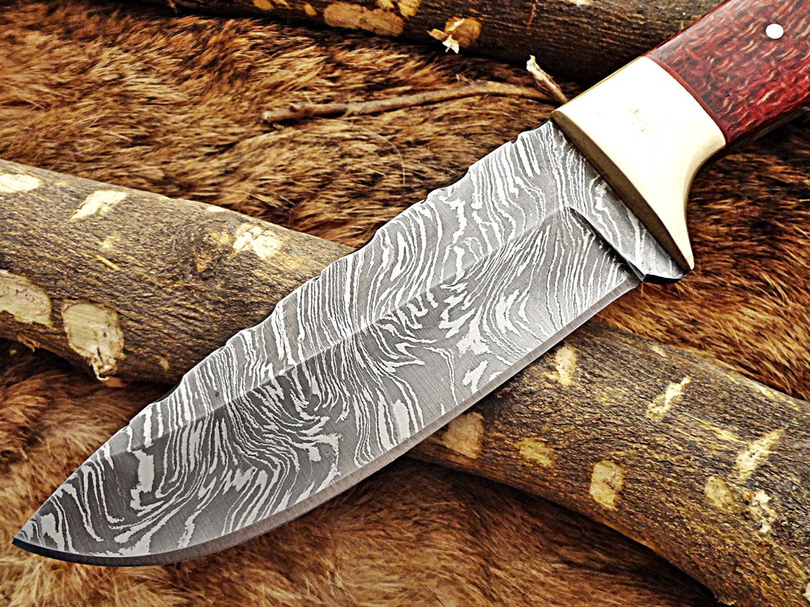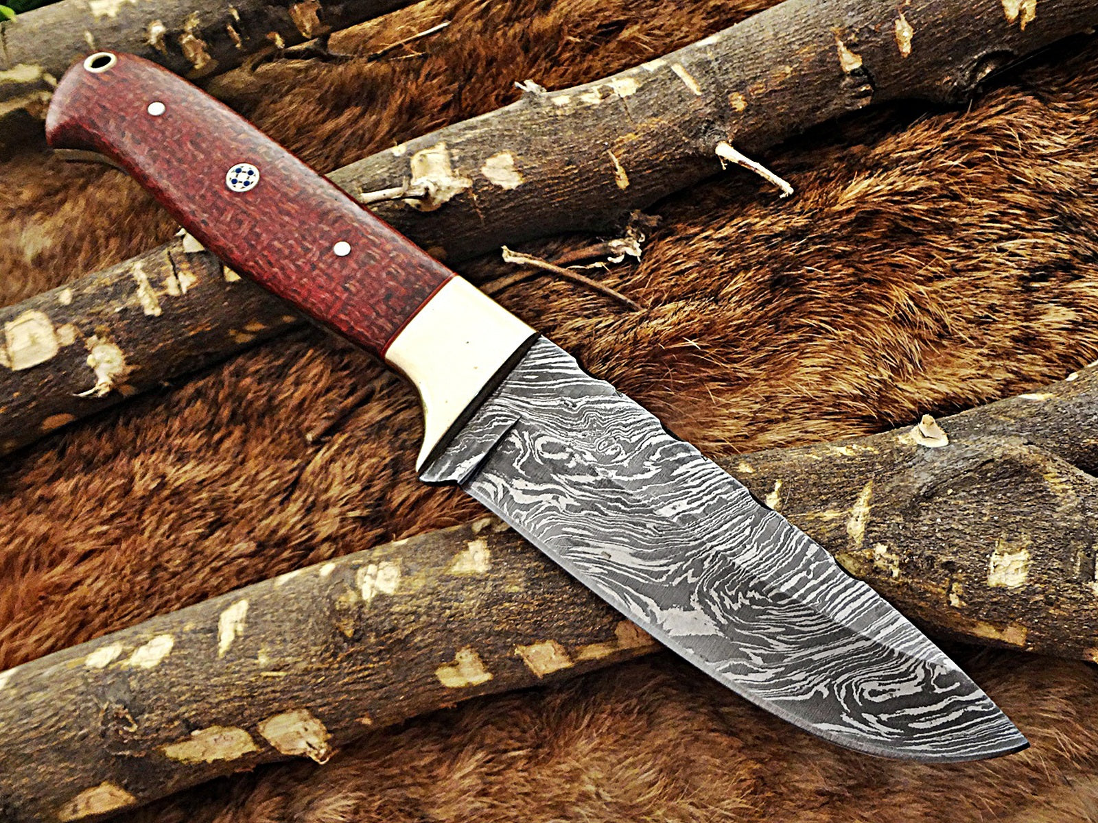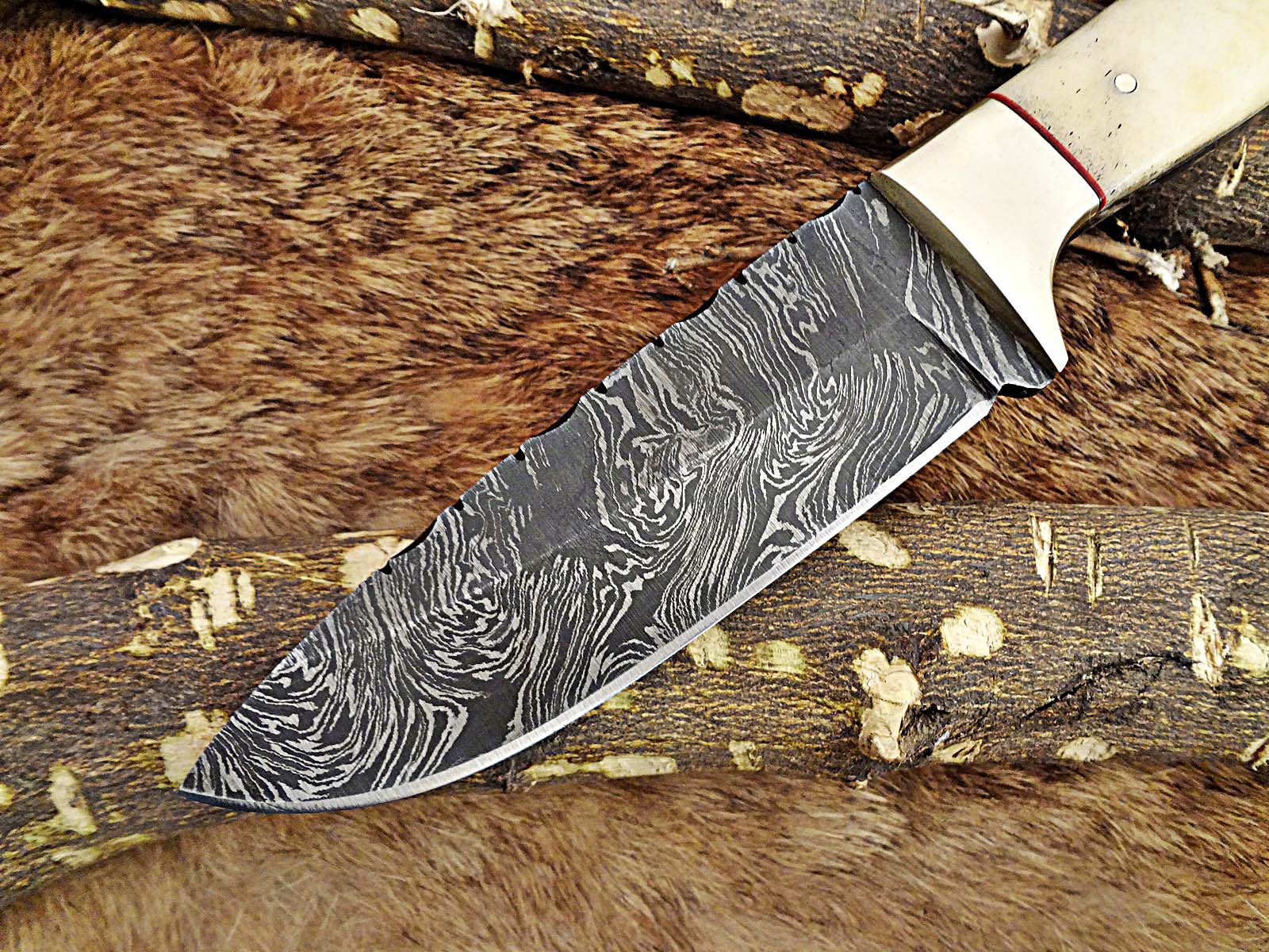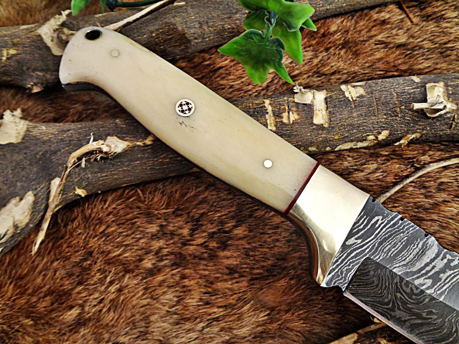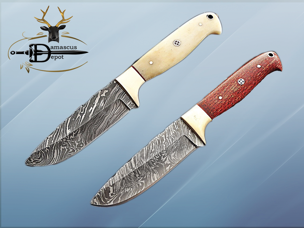 9" Damascus steel skinning knife, 4.5" full tang blade, Available in White and Red colors, includes Cow hide Leather sheath