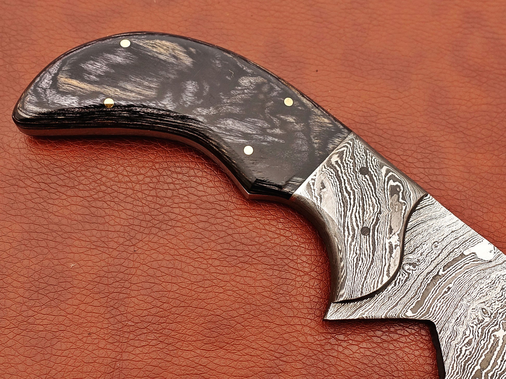 Blade is made of Damascus steel by forging the 1095 and 15N20 high and low carbon steel Blade has been given an excellent heat treatment to get it well hardened Hardness 56 to 58 HRC.