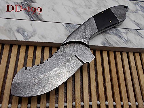 FEATURES: Bull horn scale with Damascus bolster Bull horn piece is bling with 2 silver pins for extra strength Overall 9" Long full tang knife with 4.5" long blade, 3.5" cutting edge Full tang blades are considered as more durable and stronger then non full tang Handle Length is 4.5 inches including bolster B Ring pattern Up to standard camping, compact, everyday knife Comes with a fine quality thick and robust leather sheath that can be worn on belt. Blade is made of Damascus steel by forging over 465 layers of 1095 and 15N20 high and low carbon steel. Blade has been given an excellent heat treatment to get it well hardened Hardness 56 to 58 HRC. Note: You will receive the same knife as shown in the pictures. Custom Made Only One Piece. Tips to Care Damascus knife: Damascus steel as well as 1095 high carbon steel knives are different than some other common steel knives,because of its high carbon content they can be rusted if not care properly. If you have seen rust accidentally then use WD40 to remove it Never store your knife for long time in leather sheath. Leather can absorb water which will rust the knife. Always clean the blade after using and apply oil or wax (please use cooking oil on Chef Knife) before you store it, for its longer life and durability. DISCLAIMER: Our knives are very sharp so open and use them very carefully. We are not responsible for any injuries associated with the use of our knives. Our products are intended for legal use only by responsible buyers. We will not sell our products to anyone under the age of 18.