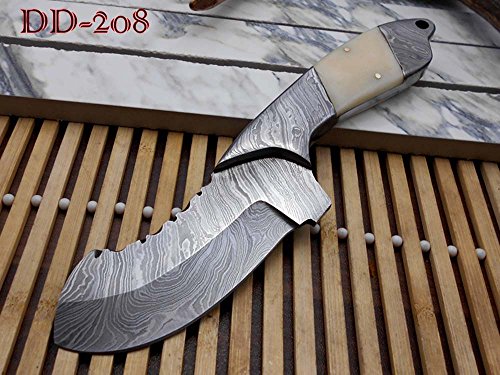 FEATURES: Camel Bone scale with Damascus bolster Camel bone piece is bling with 2 silver pins for extra strength Overall 9" Long full tang knife with 4.5" long blade, 3.5" cutting edge Full tang blades are considered as more durable and stronger then non full tang Handle Length is 4.5 inches including bolster B Ring pattern Up to standard camping, compact, everyday knife Comes with a fine quality thick and robust leather sheath that can be worn on belt. Blade is made of Damascus steel by forging over 465 layers of 1095 and 15N20 high and low carbon steel. Blade has been given an excellent heat treatment to get it well hardened Hardness 56 to 58 HRC. Note: You will receive the same knife as shown in the pictures. Custom Made Only One Piece. Tips to Care Damascus knife: Damascus steel as well as 1095 high carbon steel knives are different than some other common steel knives,because of its high carbon content they can be rusted if not care properly. If you have seen rust accidentally then use WD40 to remove it Never store your knife for long time in leather sheath. Leather can absorb water which will rust the knife. Always clean the blade after using and apply oil or wax (please use cooking oil on Chef Knife) before you store it, for its longer life and durability. DISCLAIMER: Our knives are very sharp so open and use them very carefully. We are not responsible for any injuries associated with the use of our knives. Our products are intended for legal use only by responsible buyers. We will not sell our products to anyone under the age of 18.