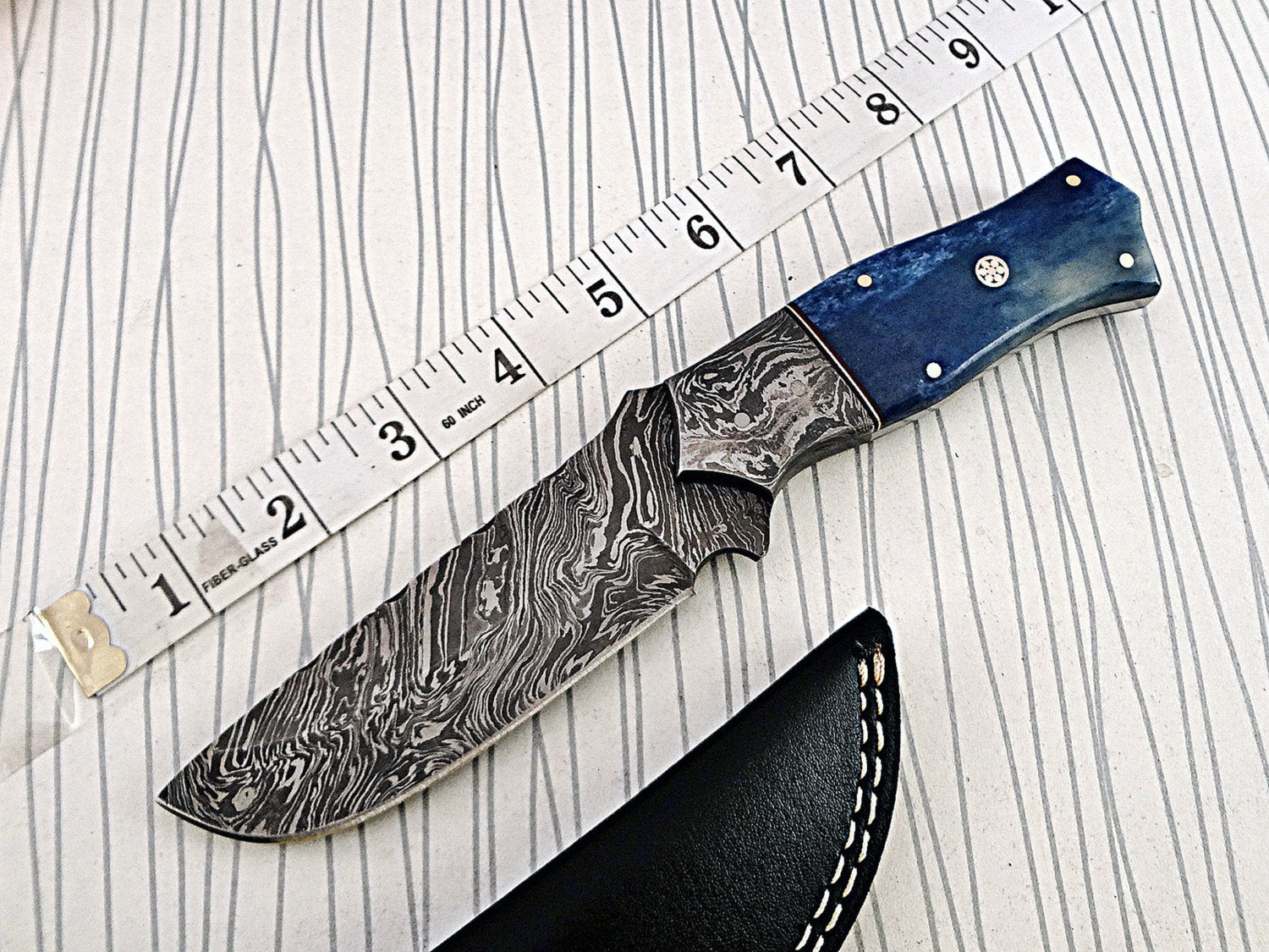 9" long Damascus steel custom made hunting Knife blue colored camel bone scale full tang Hand Forged 4" cutting edge cow hide leather sheath