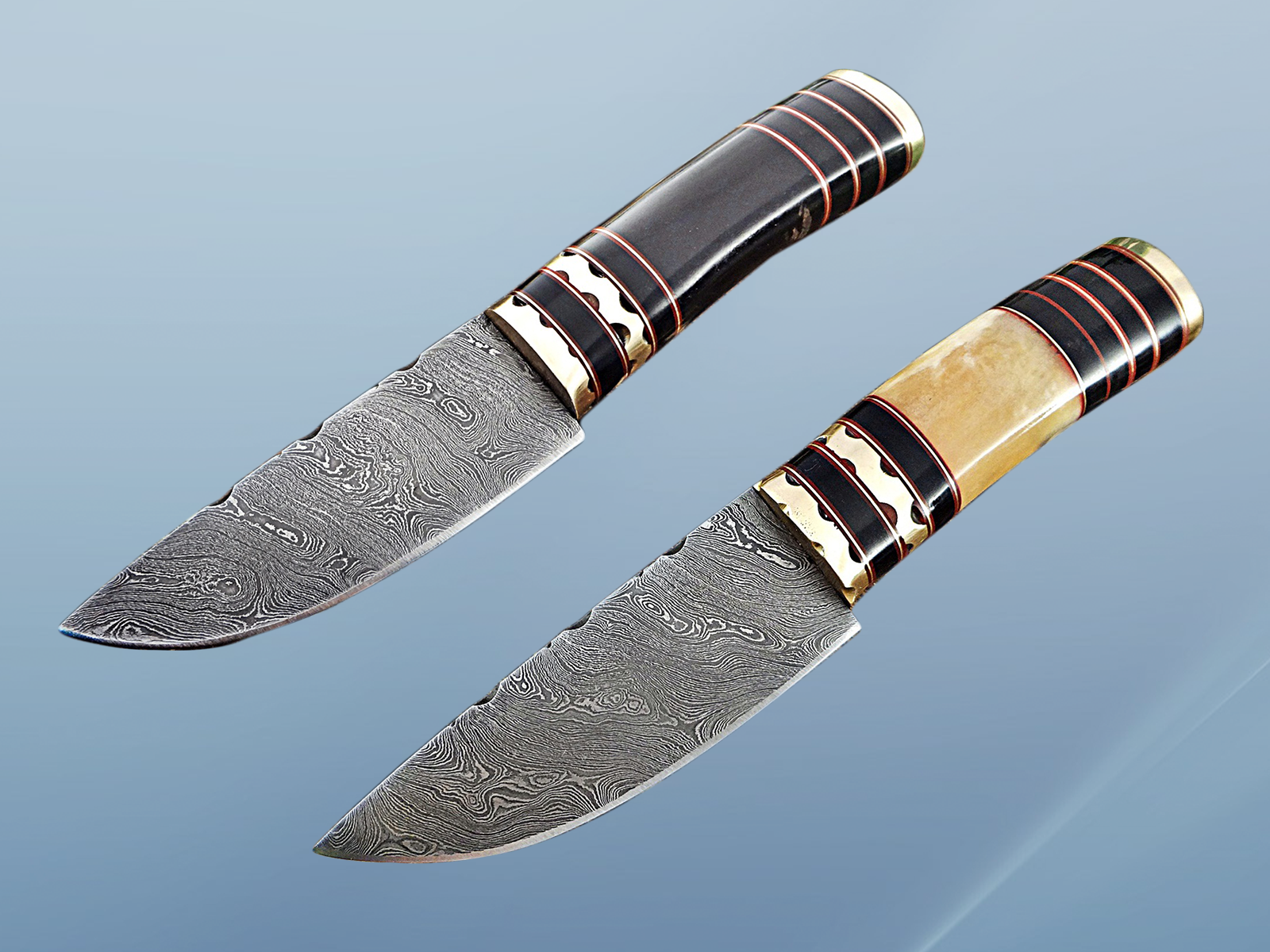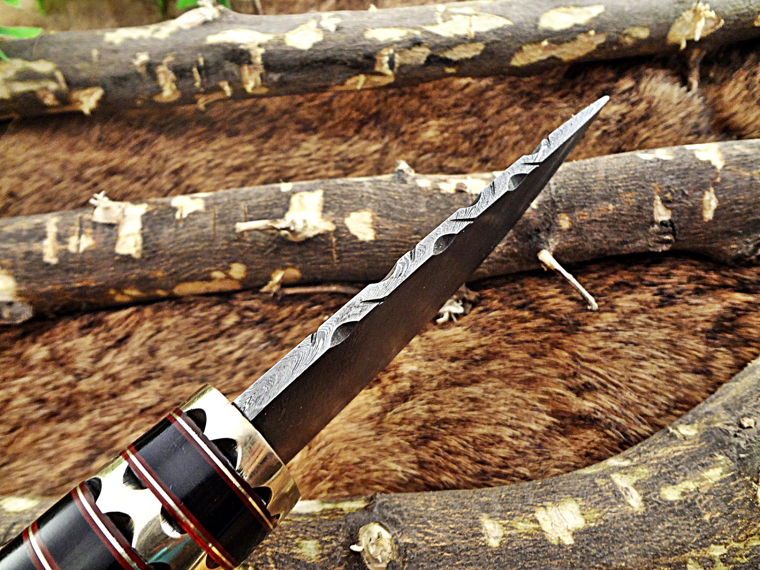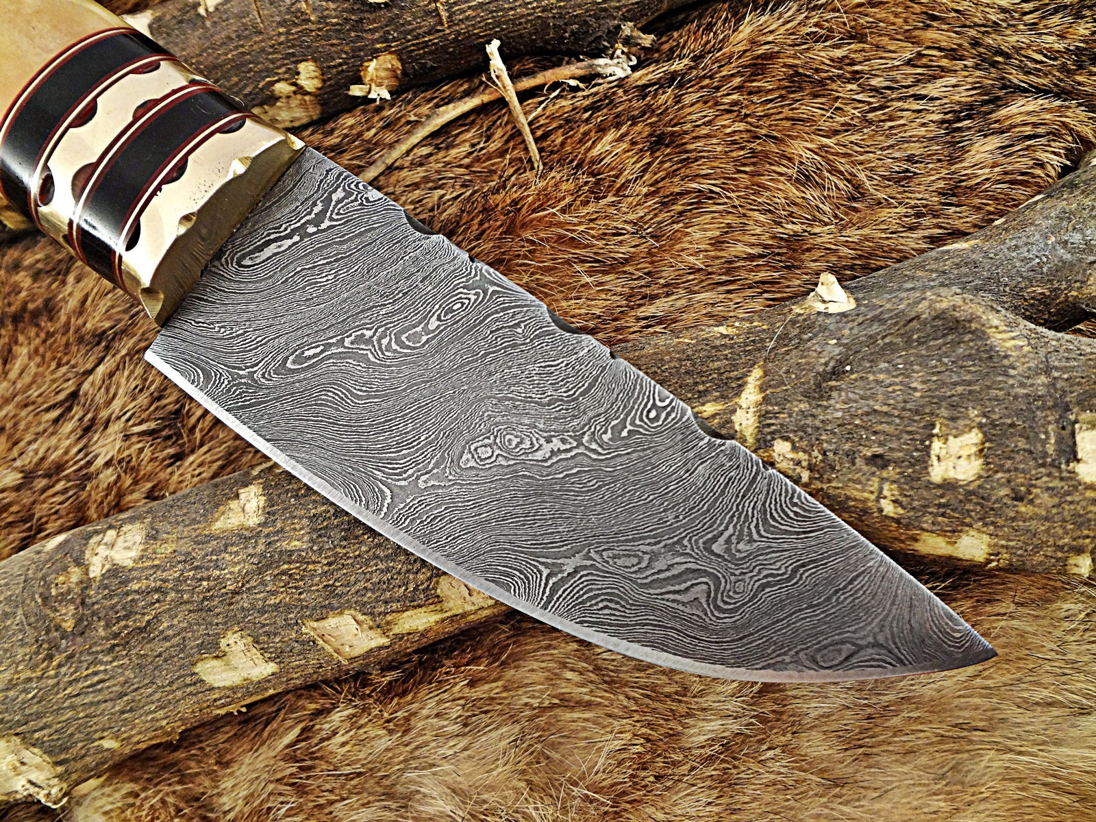 9" Long hand forged Damascus steel Knife, Buffalo Horn round scale with engraved Brass and fiber spacing, cow hide Leather sheath