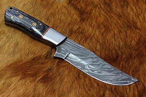 Features: Natural polished Walnut wood scale with Damascus bolster 4.5" long Scale is bling with a 5 silver pins and an inserting hole for extra strength Overall 9" Long with 4.5" long full tang blade Full tang blades are considered stronger and durable then non full tang Approximately 5 mm thick Twist pattern Damascus steel blade Up to standard skinning and hunting Knife Comes with a fine quality extra thick and robust leather sheath. The sheath has belt inserting loop and can be worn on belt. Blade is made of Damascus steel by forging the 1095 and 15N20 high and low carbon steel Our Damascus steel is prepared by forging over 465 layer of high carbon and low carbon steel. Blade has been given an excellent heat treatment to get it well hardened Hardness 56 to 58 HRC. Tips to Care Damascus knife: Damascus steel as well as 1095 high carbon steel knives are different than some other common steel knives,because of its high carbon content they can be rusted if not care properly. If you have seen rust accidentally then use WD40 to remove it Never store your knife for long time in leather sheath. Leather can absorb water which will rust the knife. Always clean the blade after using and apply oil or wax (please use cooking oil on Chef Knife) before you store it, for its longer life and durability. DISCLAIMER: Our knives are very sharp so open and use them very carefully. We are not responsible for any injuries associated with the use of our knives. Our products are intended for legal use only by responsible buyers. We will not sell our products to anyone under the age of 18.
