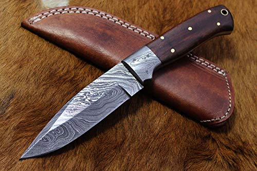 Features: Natural polished Walnut wood scale with Damascus bolster 4.5" long Scale is bling with a 5 silver pins and an inserting hole for extra strength Overall 9" Long with 4.5" long full tang blade Full tang blades are considered stronger and durable then non full tang Approximately 5 mm thick Twist pattern Damascus steel blade Up to standard skinning and hunting Knife Comes with a fine quality extra thick and robust leather sheath. The sheath has belt inserting loop and can be worn on belt. Blade is made of Damascus steel by forging the 1095 and 15N20 high and low carbon steel Our Damascus steel is prepared by forging over 465 layer of high carbon and low carbon steel. Blade has been given an excellent heat treatment to get it well hardened Hardness 56 to 58 HRC. Tips to Care Damascus knife: Damascus steel as well as 1095 high carbon steel knives are different than some other common steel knives,because of its high carbon content they can be rusted if not care properly. If you have seen rust accidentally then use WD40 to remove it Never store your knife for long time in leather sheath. Leather can absorb water which will rust the knife. Always clean the blade after using and apply oil or wax (please use cooking oil on Chef Knife) before you store it, for its longer life and durability. DISCLAIMER: Our knives are very sharp so open and use them very carefully. We are not responsible for any injuries associated with the use of our knives. Our products are intended for legal use only by responsible buyers. We will not sell our products to anyone under the age of 18.