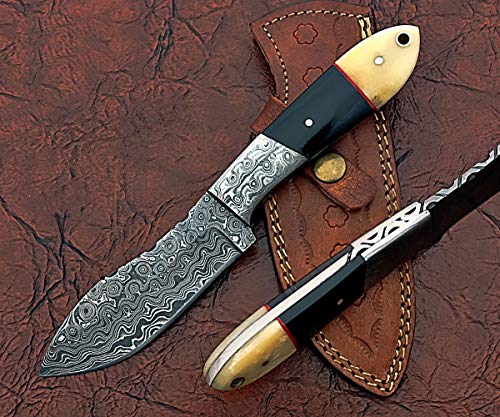 Features: Overall 9.5" Long full tang straight back blade knife Hand forged rain drop pattern Damascus steel blade Damascus steel bolster 4.5" long Scale is bling with Mosaic pin, 2 steel pins and inserting hole for extra strength Full tang blades are considered stronger and durable then non full tang Approximately 5 mm Thick rain drop pattern Damascus steel blade Up to standard skinning pocket Knife Comes with a fine quality extra thick and robust leather sheath. The sheath has belt inserting loop and can be worn on belt. Blade is made of Damascus steel by forging the 1095 and 15N20 high and low carbon steel Our Damascus steel is prepared by forging over 465 layer of high carbon and low carbon steel. Blade has been given an excellent heat treatment to get it well hardened Hardness 56 to 58 HRC. Tips to Care Damascus knife: Damascus steel as well as 1095 high carbon steel knives are different than some other common steel knives,because of its high carbon content they can be rusted if not care properly. If you have seen rust accidentally then use WD40 to remove it Never store your knife for long time in leather sheath. Leather can absorb water which will rust the knife. Always clean the blade after using and apply oil or wax (please use cooking oil on Chef Knife) before you store it, for its longer life and durability.